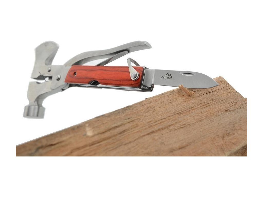 Potřebujete narychlo uříznout kousek dřeva, zatlouct hřebík nebo si jen otevřít plechovku s osvěžujícím nápojem? Multifunkční nůž Cattara Multi Hammer vám s těmito aktivitami pomůže. Vejde se vám do kapsy nebo ho přichytíte pomocí textilního pouzdra za opasek. V nožíku se skrývá celkem 12 nástrojů, které máte neustále při sobě, ať už jste doma, na rybách nebo kempujete v přírodě.