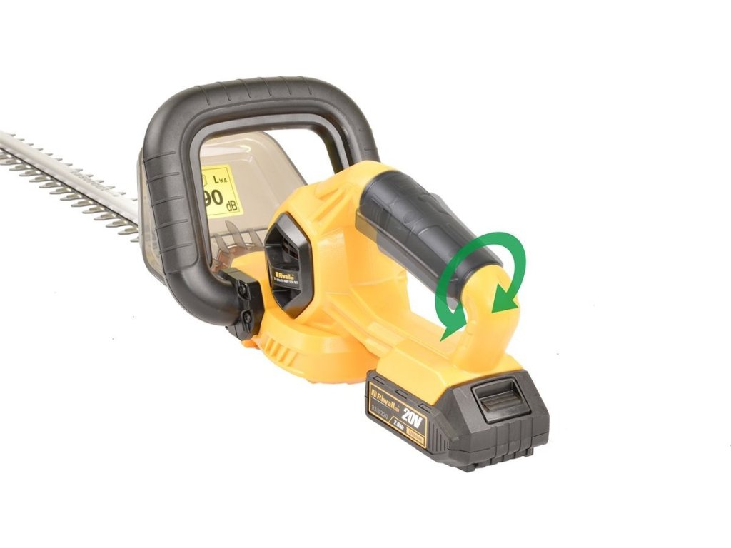Nůžky na živý plot jsou opatřeny také ergonomicky tvarovanou rukojetí pro pohodlné držení. Rukojeť je navíc otočná pro bezpečný úchop při práci v různých polohách. Průhledný kryt ruky v přední části umožňuje snadnou kontrolu průběhu stříhání a ochrání vás před odletujícími větvičkami.