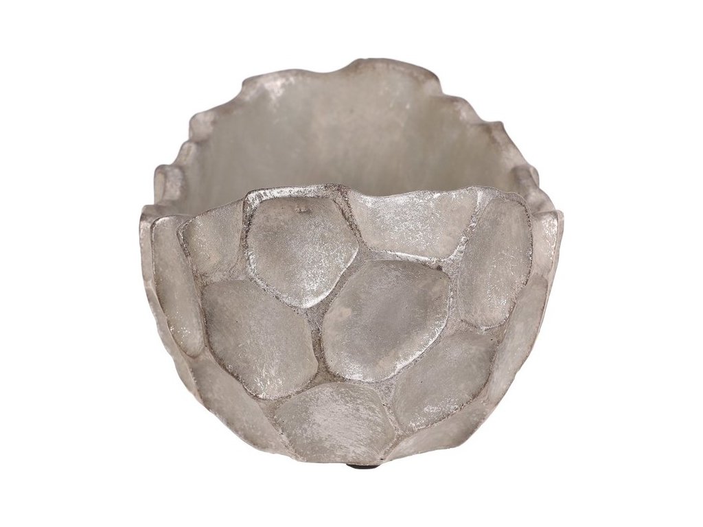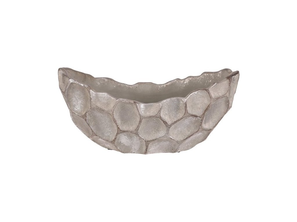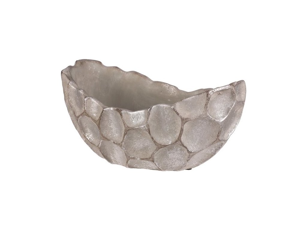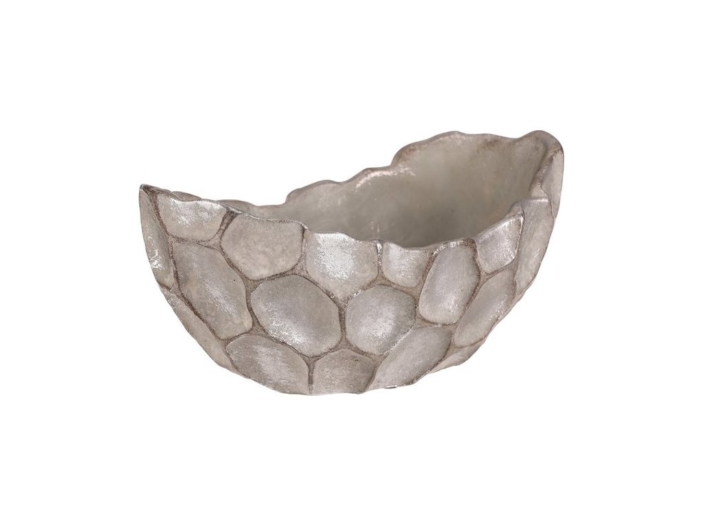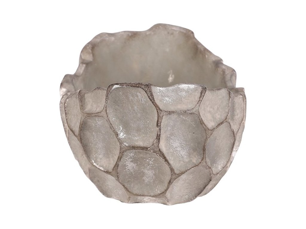 Betonový obal ve tvaru vaničky s povrchovou úpravou ve stříbrno-šedé barvě zaujme svým vzorem připomínajícím buňky. Jeho robustní základ z betonu je navržen pro dlouhou životnost a snadnou údržbu. Organický tvar a nepravidelný reliéf dodávají dekoraci přírodní a moderní vzhled, který vynikne v interiérech i exteriérech. Obal je vhodný pro umístění květin nebo drobných dekorativních předmětů, přičemž jeho stabilní základna zajišťuje pevné postavení na různých površích.