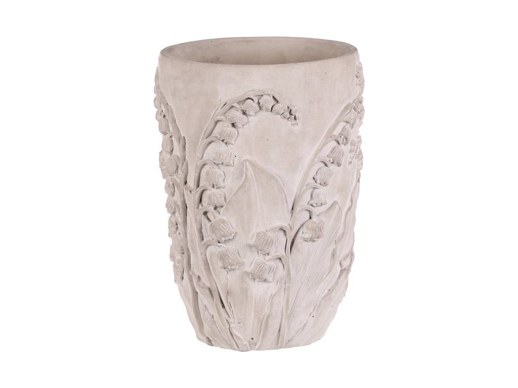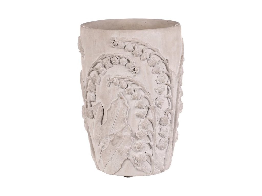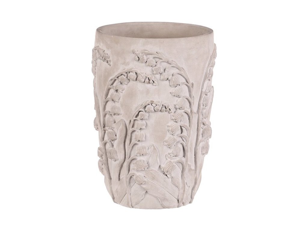 Betonový obal na květiny ve světle šedém odstínu je zdobený reliéfním vzorem konvalinek, který dodává přírodní a rustikální charakter. Jeho pevný základ z betonu zajišťuje stabilitu a dlouhou životnost, přičemž povrchová úprava zachovává surový betonový vzhled. Větší velikost L umožňuje umístění objemnějších rostlin či květinových aranžmá, což z něj činí praktický a zároveň dekorativní doplněk interiéru i exteriéru. Díky robustnímu provedení se snadno udržuje a odolává běžným vlivům prostředí. Obal je vhodný pro použití na terasy, balkony i v zahradách, kde vynikne jeho přírodní textura a detailní květinový motiv.