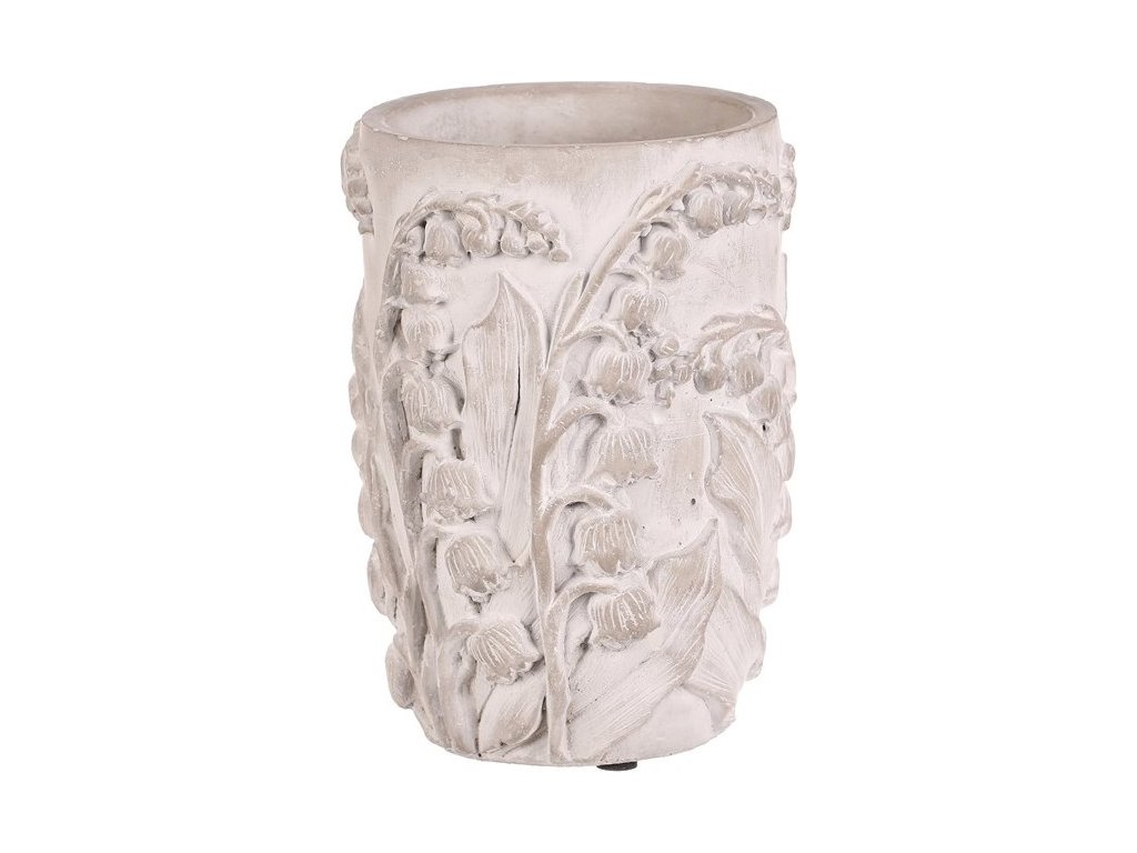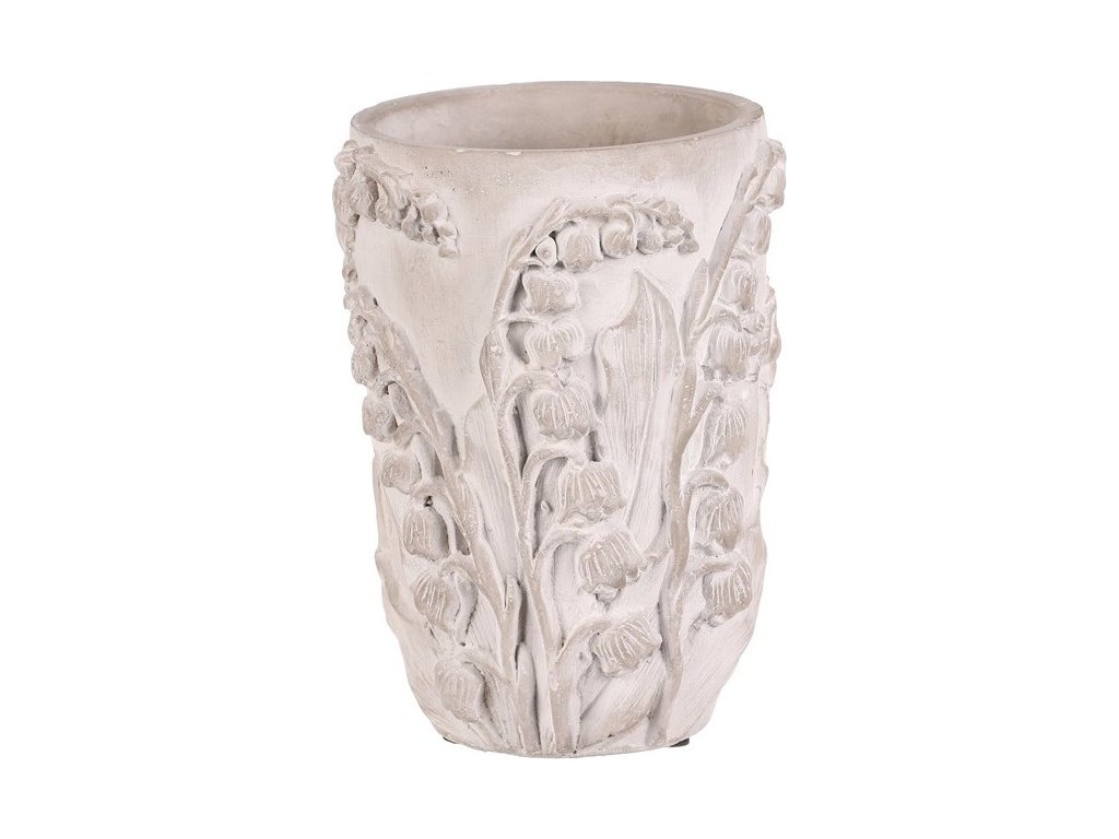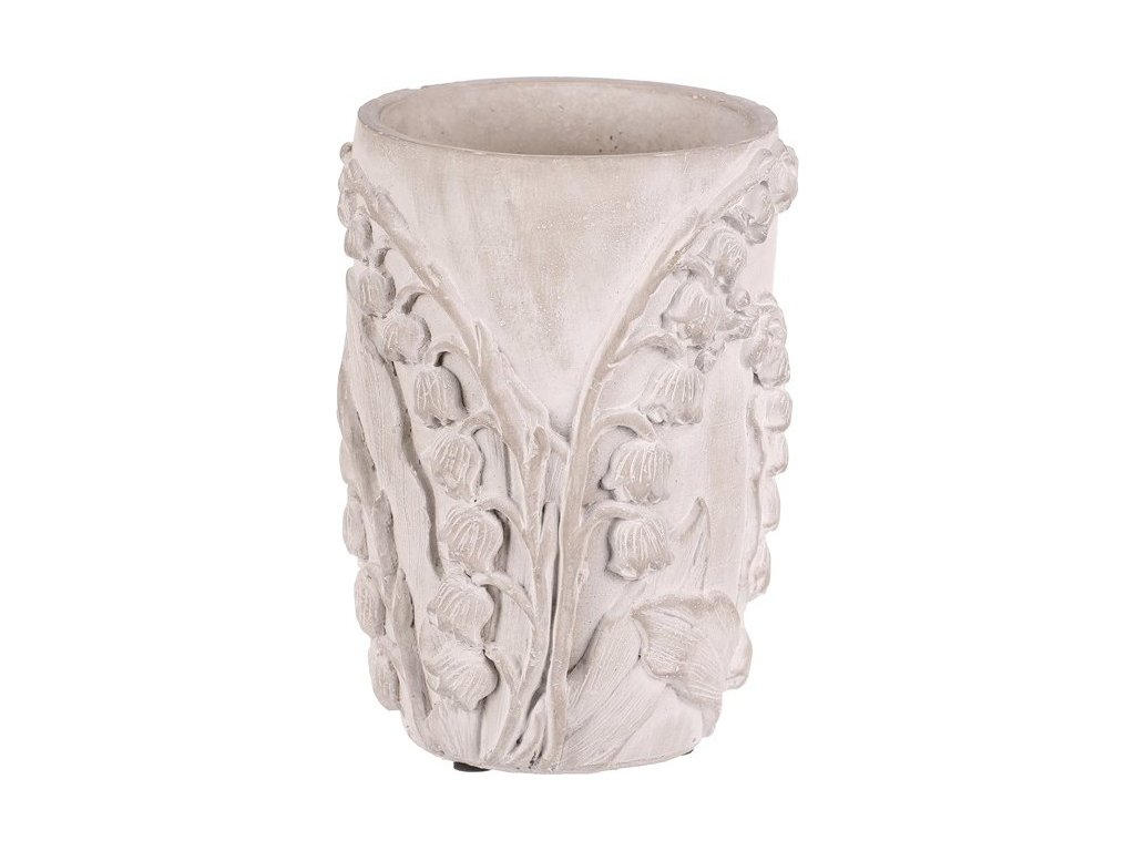 Betonový obal na květiny ve světle šedém odstínu je zdobený reliéfním vzorem konvalinek, který dodává přírodní a rustikální vzhled. Jeho pevná struktura z betonu zajišťuje stabilitu a dlouhou životnost, vhodný je pro venkovní i vnitřní použití. Kompaktní velikost S umožňuje umístění na okenní parapet, stůl nebo menší poličku. Povrch má jemně strukturovanou úpravu, která podtrhuje detailní zpracování květinového motivu. Díky robustnímu provedení je obal vhodný pro různé druhy květinových nádob.