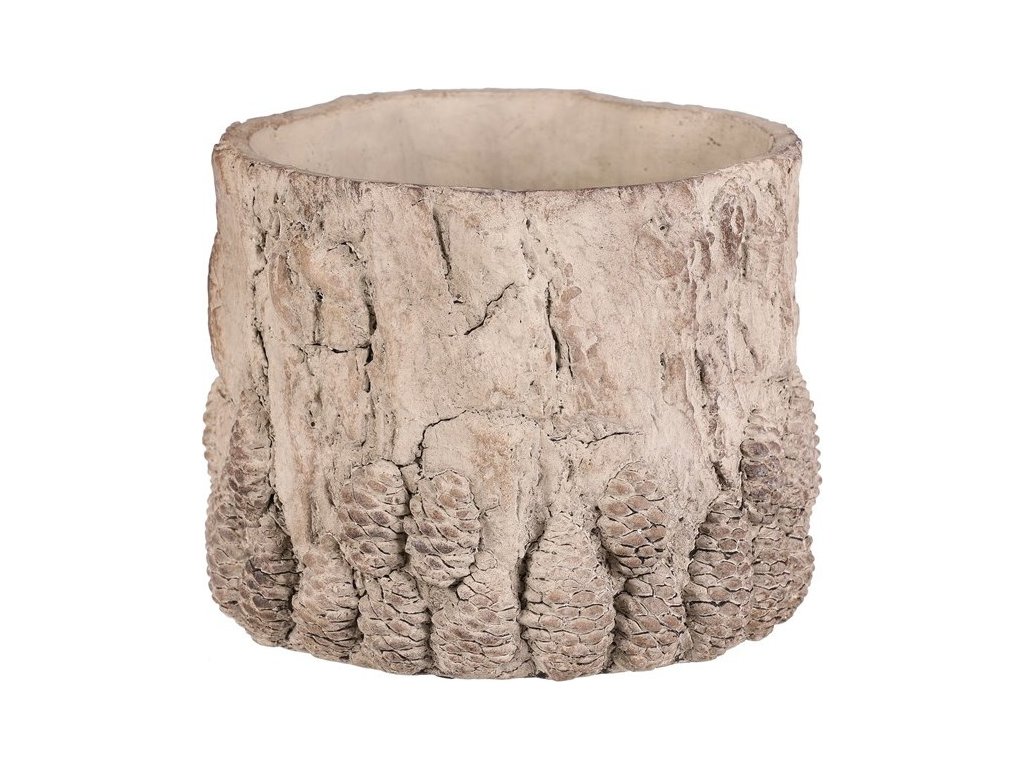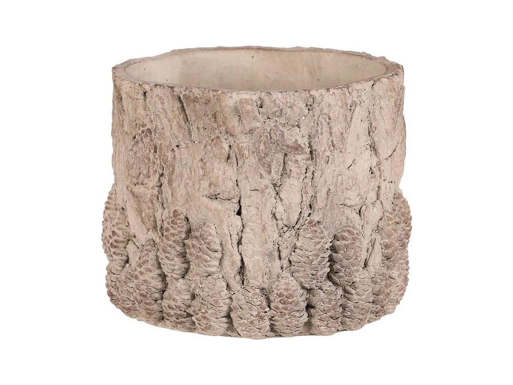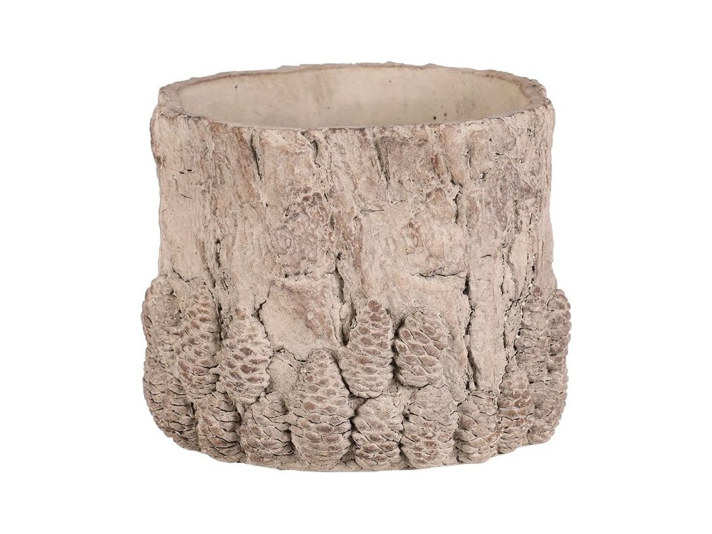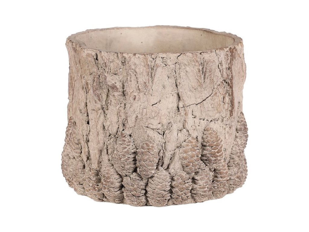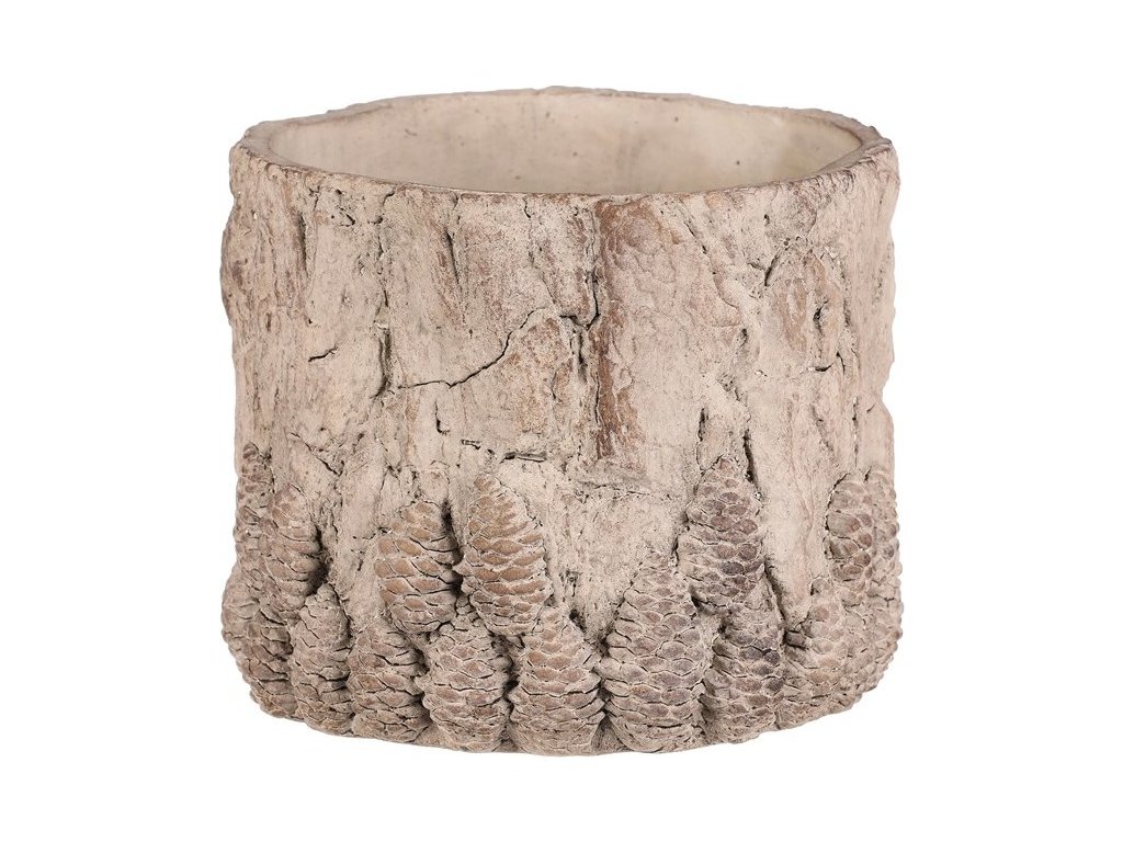 Betonový obal na květiny ve světle šedém odstínu je navržen s povrchem připomínajícím kůru stromu doplněnou reliéfními šiškami, které dodávají přírodní a rustikální vzhled. Provedení je robustní a materiál beton zajišťuje stabilitu a dlouhou životnost produktu. Obal střední velikosti je vhodný pro umístění na terasu, balkon nebo do interiéru, kde podtrhne dekorativní charakter rostlin. Jeho přírodní textura a detailní reliéf vytvářejí zajímavý vizuální kontrast s živou zelení květin.