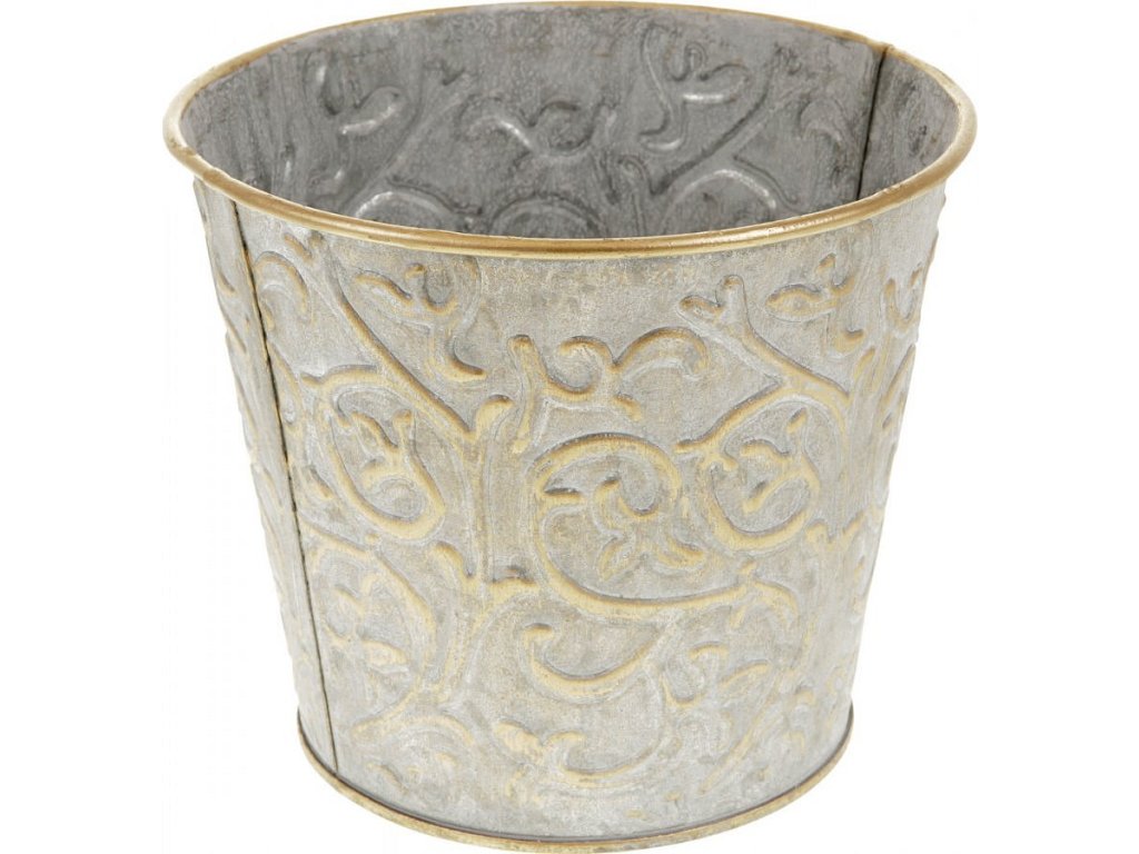 Chcete si udělat radost nevšedním vyzdobením vašeho oblíbeného prostoru květinami, a dochází vám nápady do čeho je vsadit? Zkuste sáhnout po této jedinečné dekoraci v podobě kovového obalu se zlatým okrajem a ozdobnými ornamenty a nebudete litovat. Díky svému tvaru a vzhledu se tento kovový obal stane okouzlujícím doplňkem pro vaše květiny. Kombinace krásných rostlin zasazených do takto zdobené a tvarované dekorace spolu vytvoří jedinečnou kompozici. Při pohledu na tuto vámi vytvořenou krásu budete na sebe hrdí a mít skvělý pocit z dobře odvedené práce. Přineste si do svého domova prvek originality s tímto nevšedním kovovým obalem na květiny, který okouzlí každého obdivovatele rostlin a skvěle oživí váš prostor.