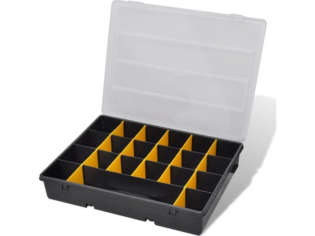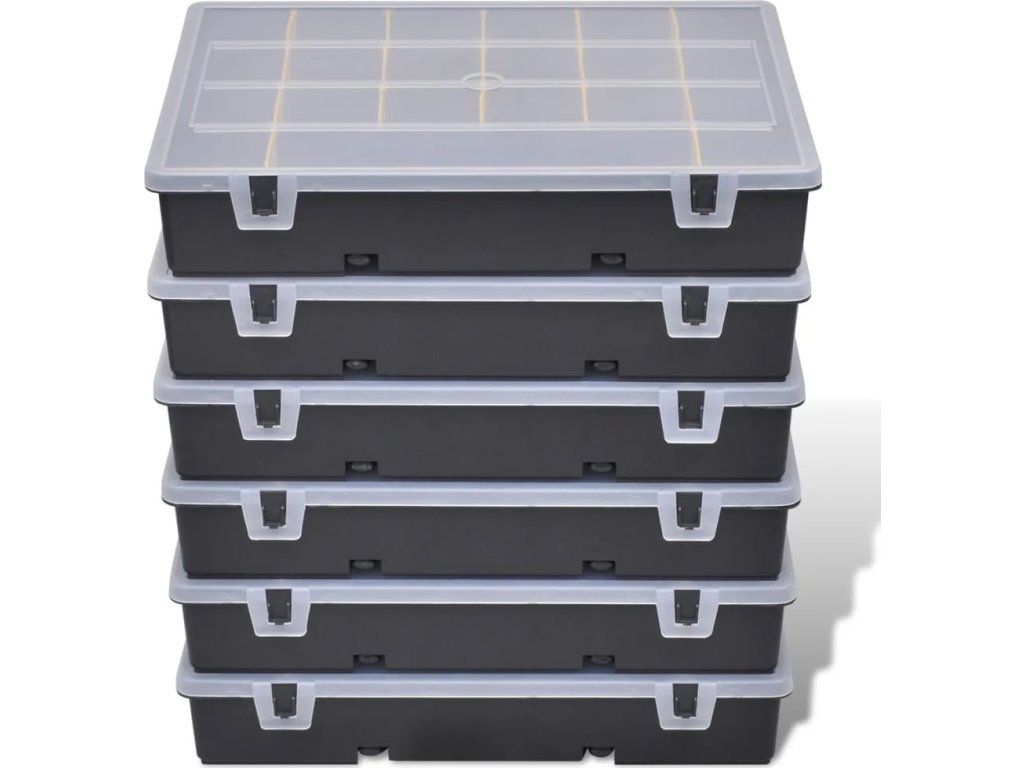 Robustní plastová sada boxů na nářadí se skládá ze 6 kusů a je ideálním pomocníkem na odkládání šroubů , matic a jiných drobných pomůcek . Každý box má 21 částí , které vám pomohou udržet pořádek v drobnostech a zajistit jejich pohodlné používání . Sada je vyrobena z kvalitního polypropylenu , má vysokou tepelnou odolnost , je odolná vůči rzi a trvanlivá. Díky madlu je box přenosný . Bude vynikajícím pomocníkem jak si uspořádat vaše pomůcky . Dodáváme 6 ks boxů na nářadí .