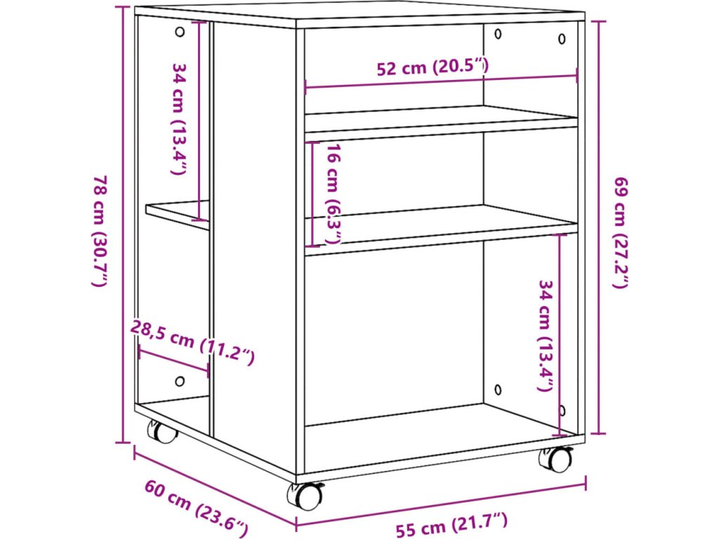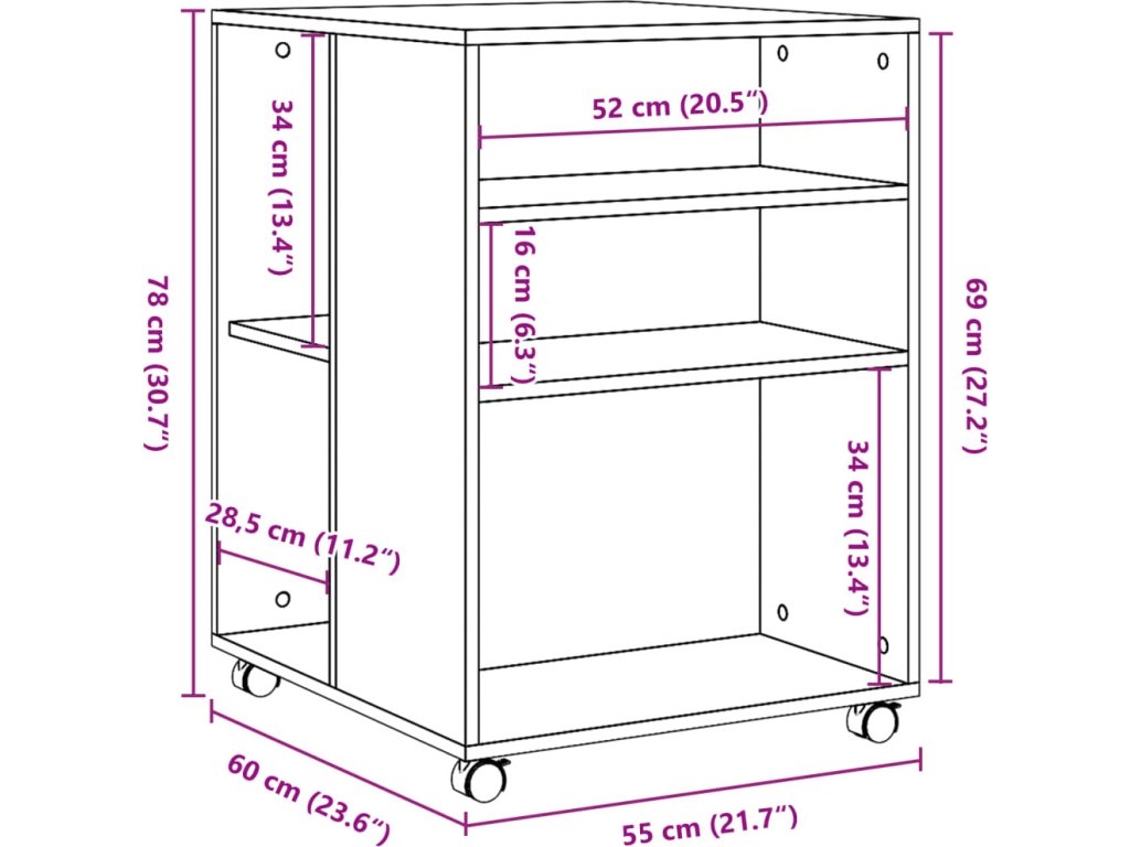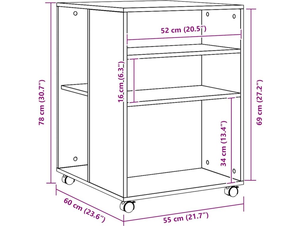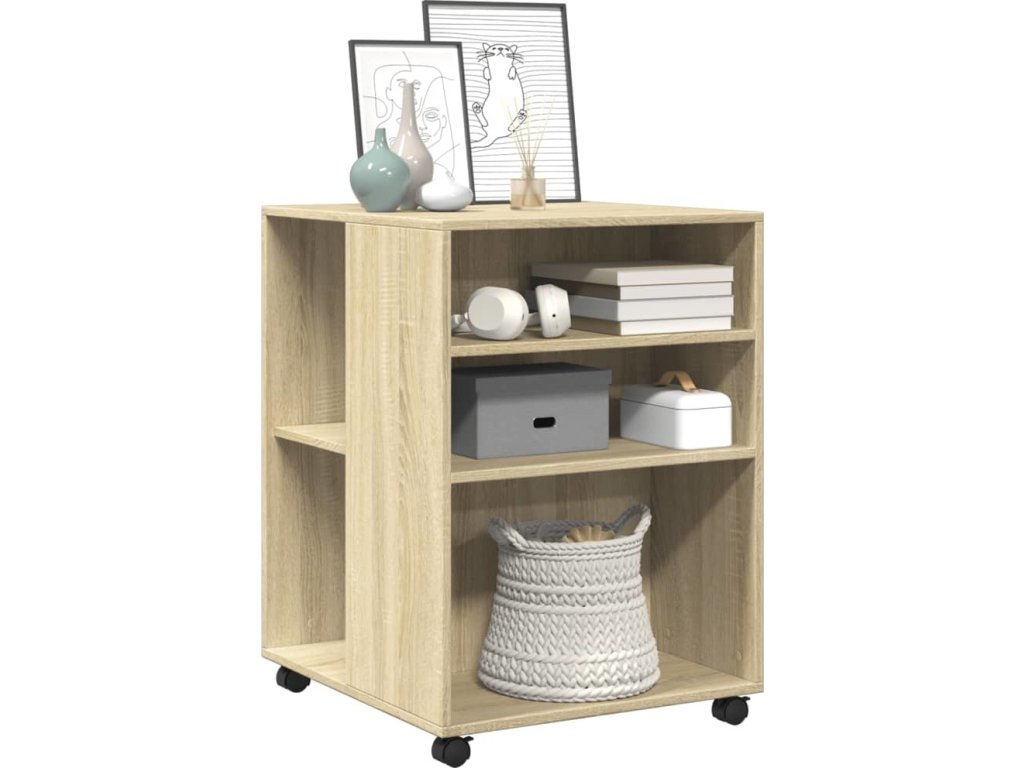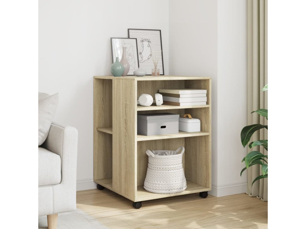 - Snadný pohyb: Tento odkládací stolek lze díky čtyřem otočným kolečkům, která jsou součástí dodávky, snadno přemístit na požadované místo. Dvě kolečka jsou uzamykatelná, což udržuje skříňku na místě a zvyšuje stabilitu.