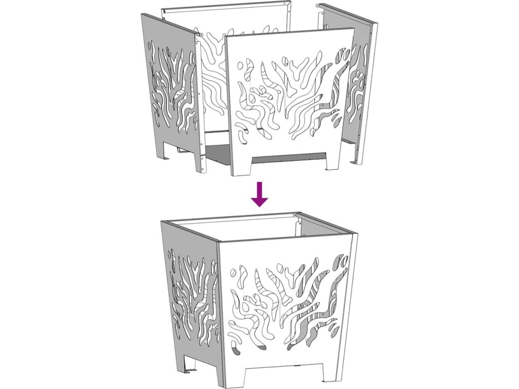 Toto moderní čtvercové venkovní ohniště dodá příjemnou atmosféru na váš balkon nebo terasu. Je vyrobené z odolné, tepelně rezistentní oceli a jeho elegantní design spojuje praktické funkce s moderním vzhledem. Skvělá volba na venkovní odpočinek a teplo.