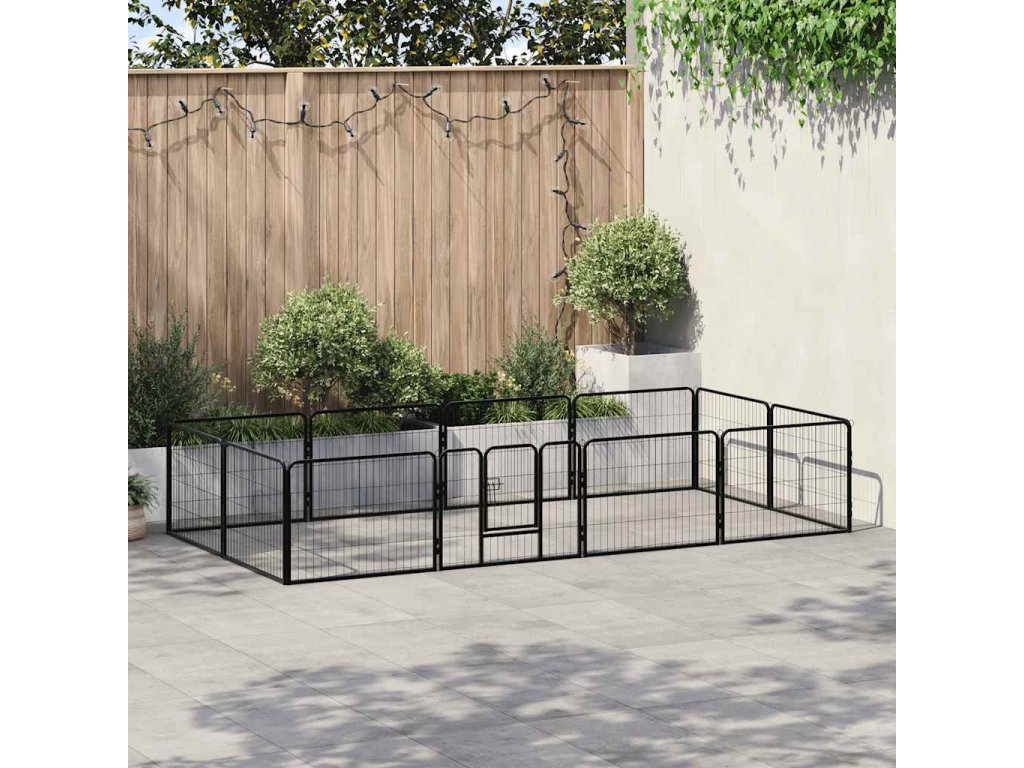 Psí výběh se dá snadno rozložit nebo složit. Skládá se ze 12 vysoce odolných panelů, přičemž každý panel lze snadno připojit k dalšímu, což vám umožní stavět ohrádku do různých tvarů. Výběh je opatřen závěsnými dvířky s bezpečnostní západkou, jež zajišťují snadný přístup. Ohrádka je pevná, odolná vůči povětrnostním vlivům a vyrobená z rezuvzdorné oceli s práškovým nástřikem, takže je vhodná pro venkovní i vnitřní použití. Součástí dodávky jsou i kolíky pro upevnění k zemi, které zajišťují bezpečnost ohrádky pro psy a dodávají jí stabilitu.