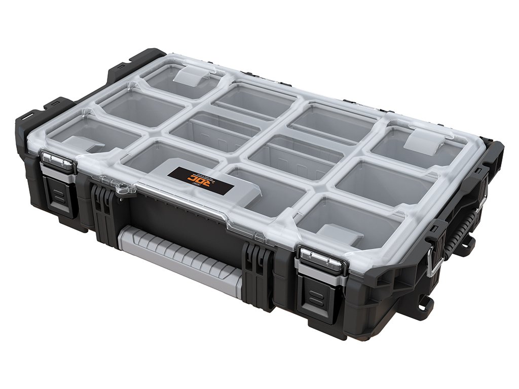 Udělejte si pořádek v dílně s organizérem ROC Pro Gear značky Keter. Skládá se z 8 menších vyjímatelných vnitřních přihrádek ve světle šedé barvě a 2 větších boxů, které můžete zmenšit pomocí 2 přepážek. Uložíte do nich spojovací materiál a další drobné pomůcky. Organizér uzavřete pomocí průhledného víka. Díky němu máte přehled o jeho obsahu. Organizér navíc odolá nárazům.