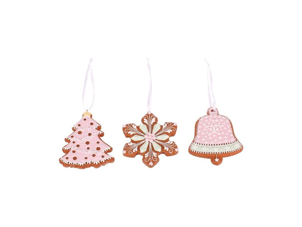 Závěsné perníkové dekorace v podobě stromku, sněhové vločky a zvonku, budou skvělou volbou pro vánoční výzdobu. Jsou sice vyrobené z polyresinu, ale vypadají skutečně jako by je upekl a vyzdobil sám mistr cukrář. Kombinace hnědé barvy s bílou, zelenou a růžovou polevou je prostě kouzelná. Jedná se o mix 3 druhů, ale cena uvedená na hlavičce produktu je za jednu ozdobu.