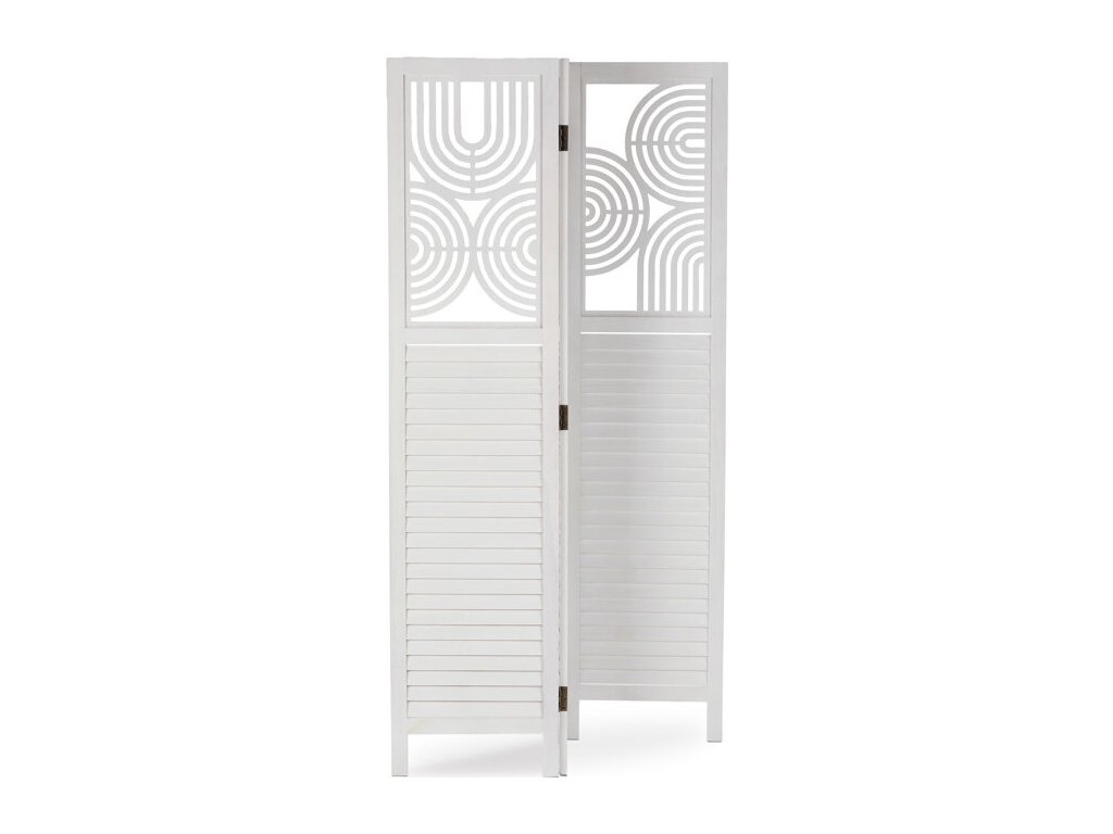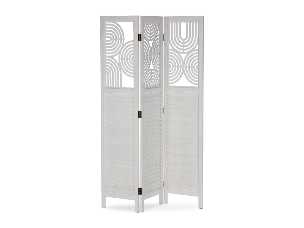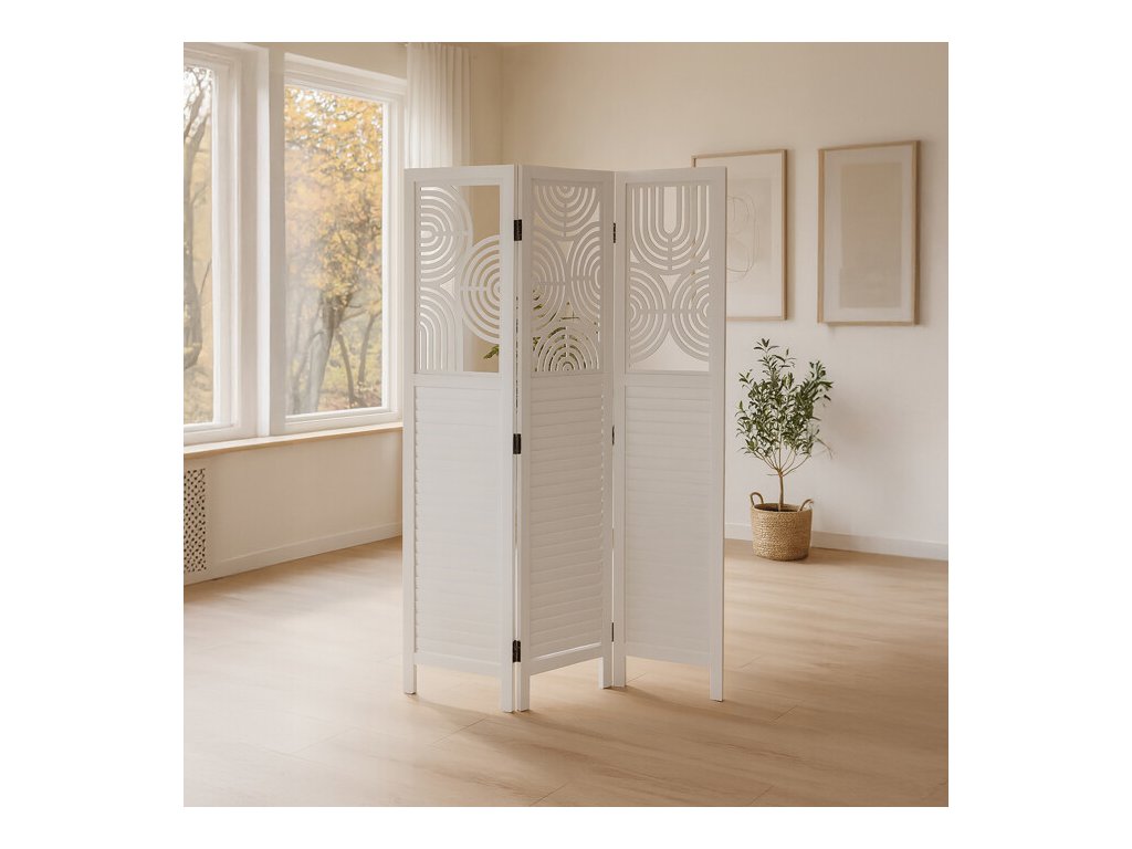 Třípanelový paraván vyrobený z masivního smrkového dřeva v bílé barvě nabízí praktické řešení pro rozdělení prostoru v interiéru. Každý díl je doplněn dekorativními výřezy v horní části, které propouštějí světlo a zároveň zachovávají soukromí. Masivní materiál zajišťuje pevnost a stabilitu, zatímco přírodní textura dřeva dodává výrobku přirozený vzhled. Paraván je vhodný pro použití v obývacích pokojích, ložnicích nebo kancelářích, kde pomáhá vytvořit útulné a funkční prostředí. Díky skládací konstrukci je snadno přemístitelný a skladovatelný.