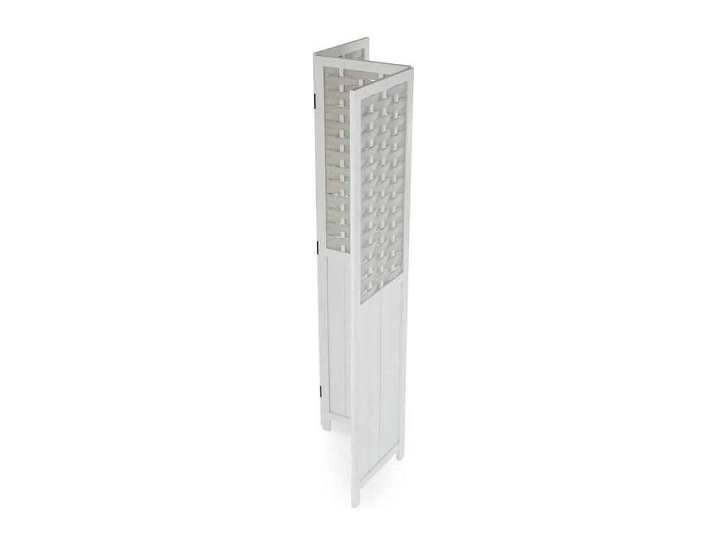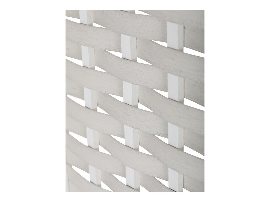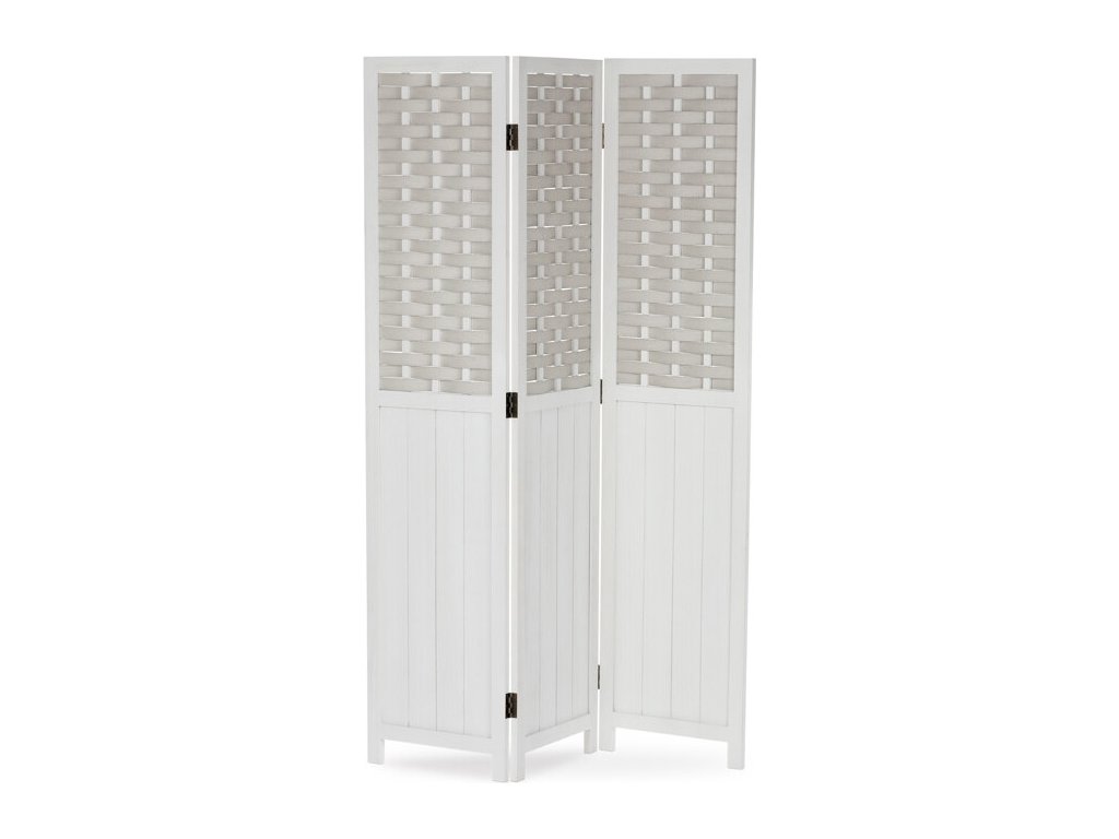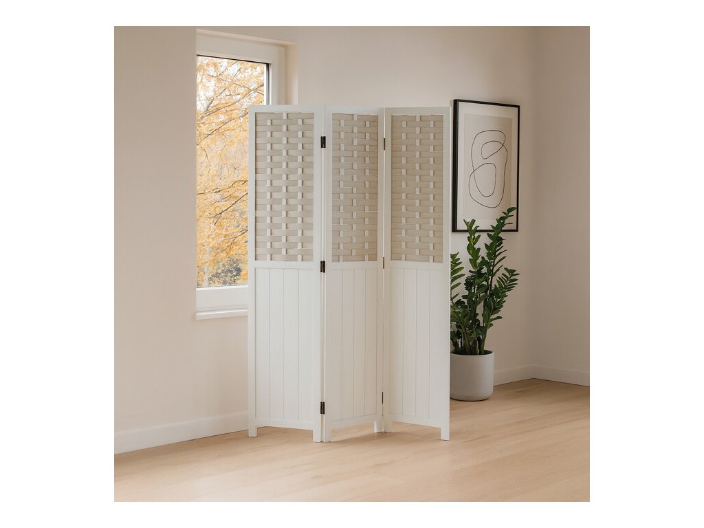 Třídílný paraván z masivního smrkového dřeva v bílé barvě nabízí praktické řešení pro rozdělení prostoru či vytvoření soukromí v interiéru. Každý díl je tvořen pevnou rámovou konstrukcí s dolní částí z masivních PVC lamel a horní částí s proplétaným vzorem, který dodává lehkost a zajímavý vizuální efekt. Díky pevním kovovým pantům lze jednotlivé díly snadno skládat a nastavit do požadovaného úhlu, což zajišťuje stabilitu a variabilitu použití. Povrchová úprava bílým nátěrem podtrhuje přírodní charakter dřeva a umožňuje snadnou údržbu. Paraván je vhodný pro použití v domácnostech i komerčních prostorách, kde oceníte kombinaci funkčnosti a decentního designu. Rozměr jednoho dílu je 40x171 cm.