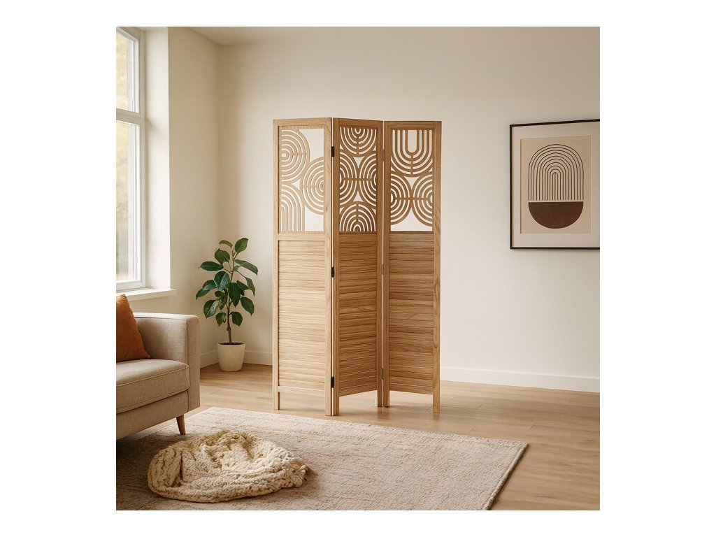 Třídílný dřevěný paraván z masivu smrku v přírodním odstínu kombinuje pevné provedení s dekorativní perforací horní části, která vytváří zajímavý vizuální efekt. Každá část je spojena kovovými panty umožňujícími flexibilní nastavení úhlu a snadné přenášení či skladování. Paraván slouží jako praktický prvek pro rozdělení prostoru nebo zvýšení soukromí v interiéru, přičemž přírodní dřevěný dekor přináší do místnosti teplý a přirozený vzhled. Povrch je upraven tak, aby materiál byl snadno udržovatelný a odolný vůči běžnému opotřebení. Rozměry a konstrukce zajišťují stabilitu a dlouhou životnost produktu.