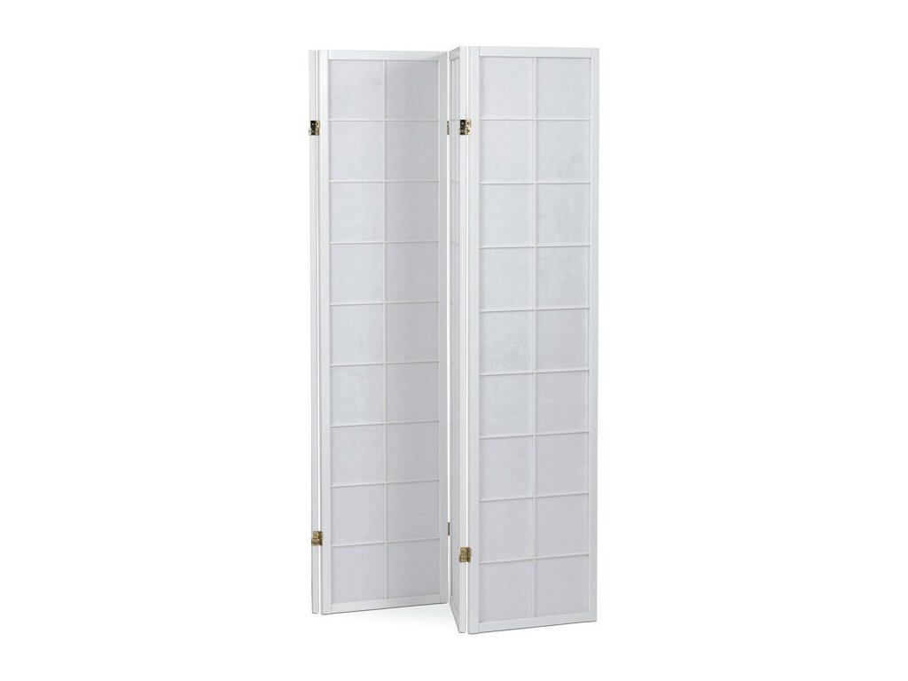 4dílný volně stojící paraván s konstrukcí z masivního smrkového dřeva v bílé barvě a výplní z bílé netkané textilie. Plní nejen funkci okrasnou, ale také praktickou. Lze jej použít jako zástěnu nebo diskrétní i optickou dělící příčku nejen v bytě, ale i v komerčních prostorách. Díky skládací konstrukci a celkové nízké hmotnosti jej lze bez problémů přemísťovat a manipulovat s ním. Kombinace dřeva a netkané textilie působí vzdušným dojmem, stylově lze paraván umístit do jakkoli zařízeného interiéru. V každém si najde zasloužené místo. Výška paravánu je 178 cm, šíře jednoho dílu 43,5 cm, celková plná šíře je 176 cm. Tloušťka stěny jsou 2 cm. Stěny paravánu jsou k sobě připevněny kovovými pomosazenými panty. Celková hmotnost je 6,5 kg.