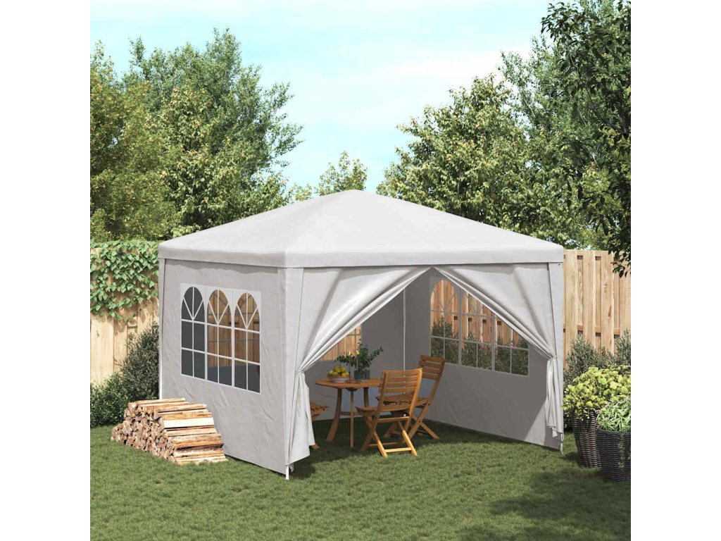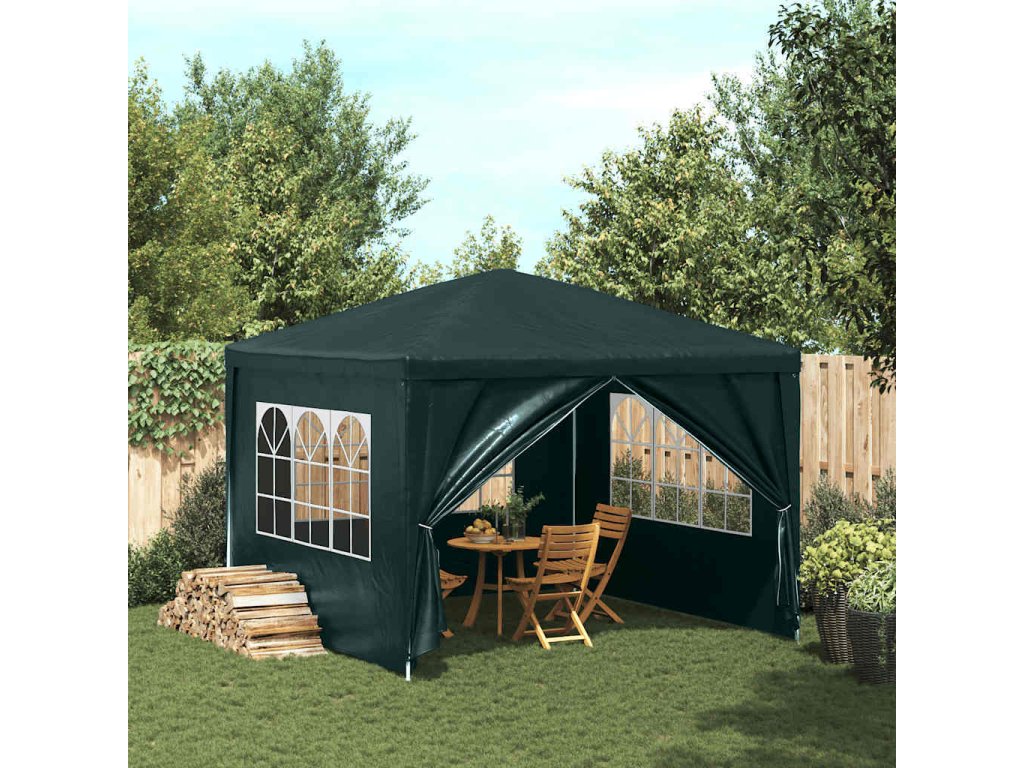 Zahradní stan je vyroben z polyethylenového materiálu odolného vůči UV záření a vodě, a proto je velmi praktický pro venkovní použití. Rám je vyroben z nerezové oceli, díky čemuž je venkovní stříška stabilní a odolná. Párty stan má boční panely, každý s ozdobnými okny, a 1 dveřní panel se zipem pro snadný vstup. Zahradní altán se snadno montuje.
