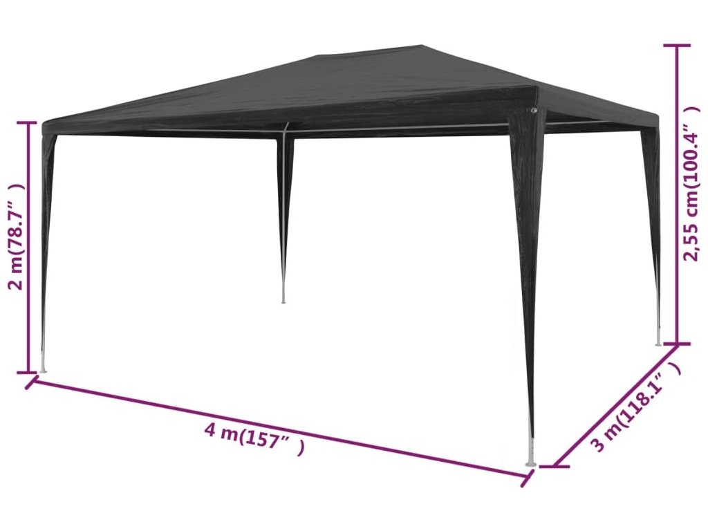 Párty stan je vyroben z polyethylenového materiálu odolného vůči UV záření a vodě, a proto je velmi praktický pro venkovní použití. Rám je vyroben z nerezové oceli, díky čemuž je venkovní stříška stabilní a odolná. Zahradní altán se snadno montuje.