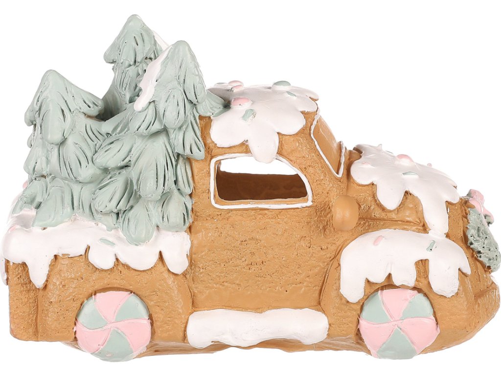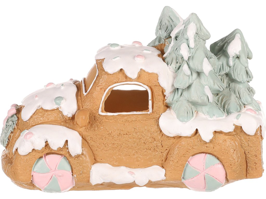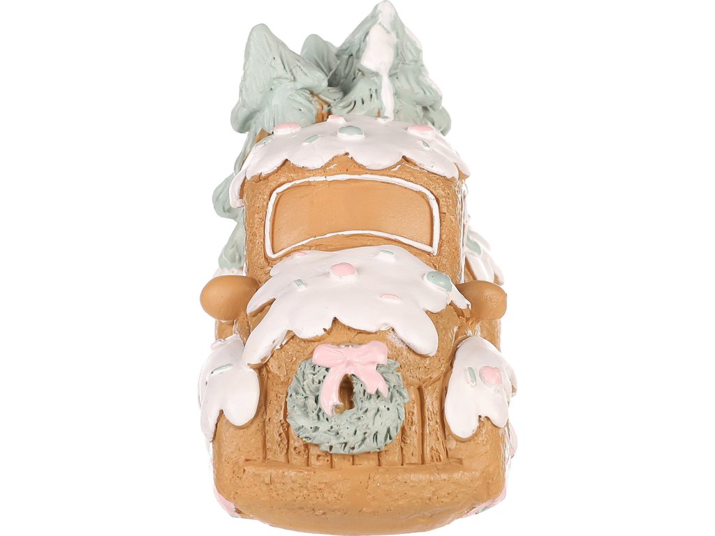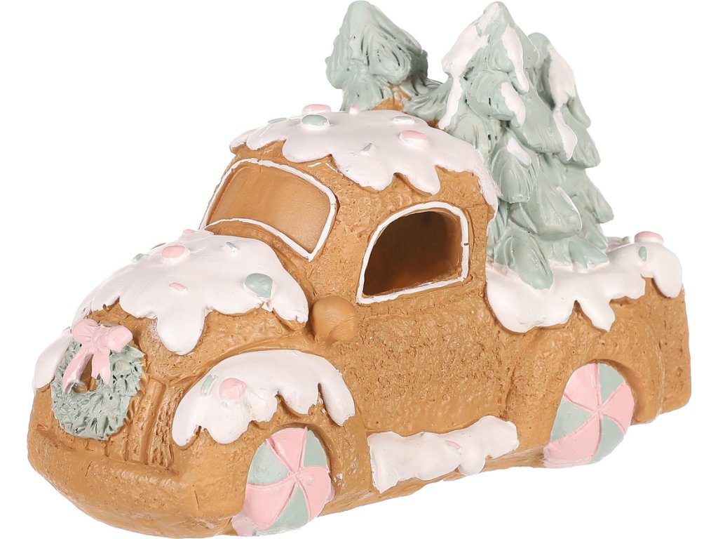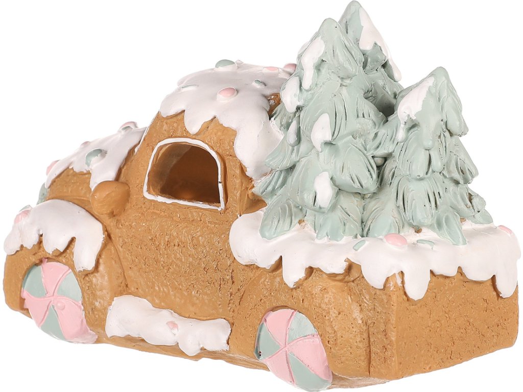 Dekorace z perníku patří k nejtypičtějším a nejkrásnějším ozdobám využívaným pro vánoční čas. Toto nádherně zdobené perníková autíčko z polyresinu, doplněné LED osvětlením uvnitř, bude skvělou volbou pro ozdobení poliček, stolů a dalších viditelných míst. Vypadá jako cukrářské mistrovské dílo, které umožňuje vytvořit neodolatelný světelný efekt díky pronikajícím paprskům světla skrze okénka ven.