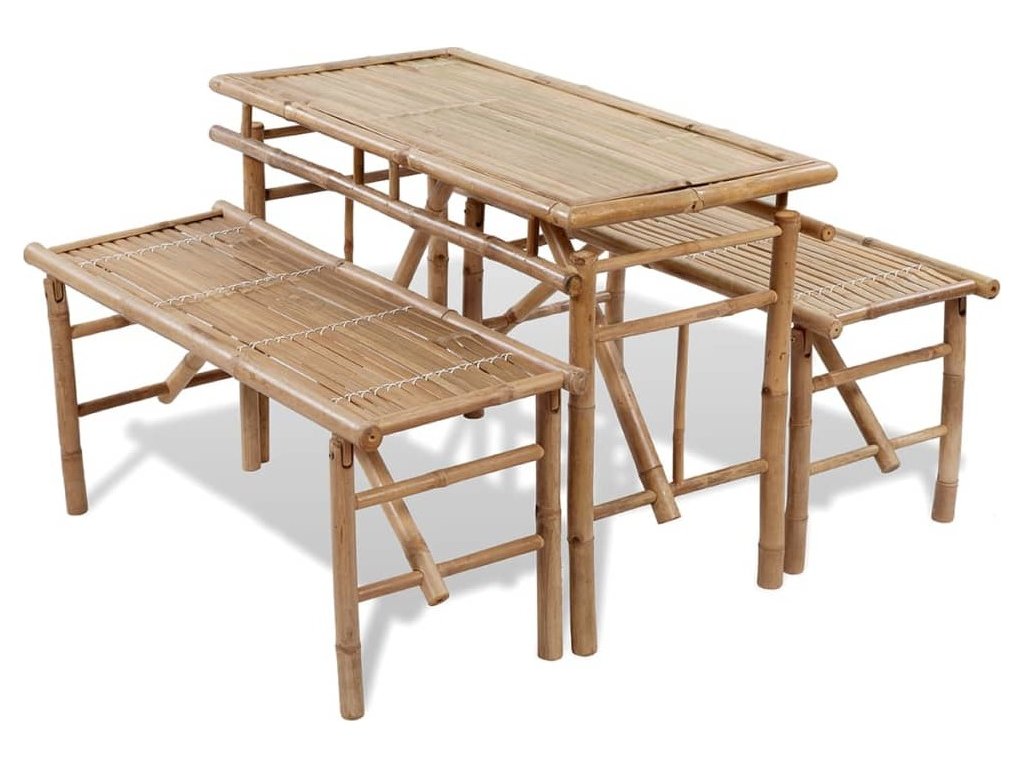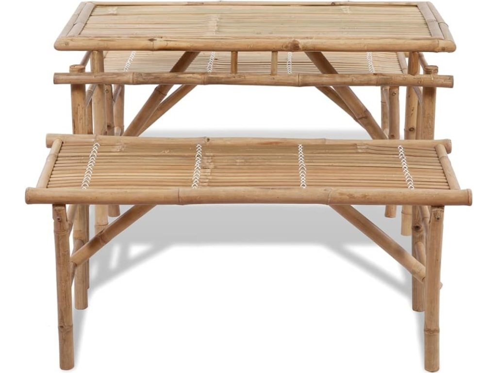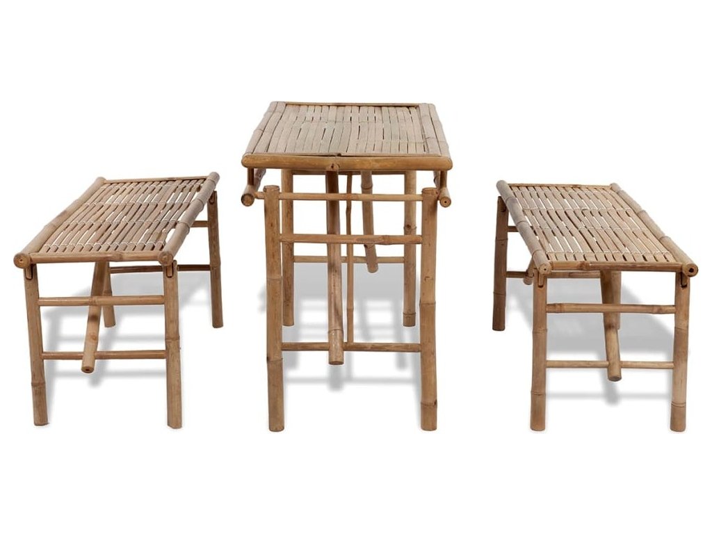 Stůl i lavice jsou skládací, a tím pádem také přenosné. Dají se snadno složit a schovat, nebo zase rozložit. Protože je vyrobený z bambusu rezistentního vůči vodě a povětrnostním vlivům, je tento zahradní nábytek odolný a také se snadno čistí vlhkým hadříkem.
