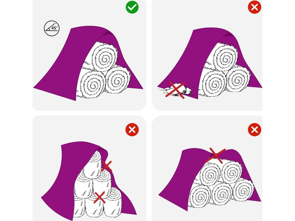 - Prodyšnost a odolnost proti plísním: plachta umožňuje únik vlhkosti a zároveň zajišťuje přísun čerstvého vzduchu k balíkům.