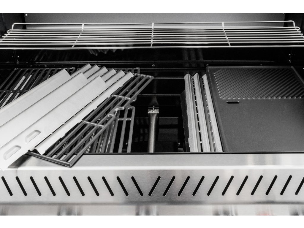 Pět hlavních hořáků s výkonem 3,5 kW poskytuje dostatečný výkon pro přípravu většího množství jídel najednou, ať už jde o maso, zeleninu nebo ryby. Boční hořák s výkonem 3,15 kW využijete pro přípravu příloh, ohřev omáček či vaření. Gril je vybavený třemi litinovými rošty a jedním litinovým plátem, které rovnoměrně rozvádějí teplo. Součástí výbavy je také nerezový rošt na ohřev. Ten je ideální pro odkládání hotových pokrmů, aniž by došlo k jejich připalování.