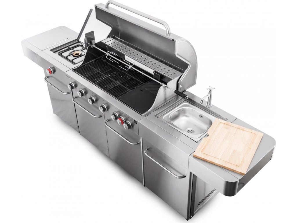 Vše na jednom místě – můžete zároveň grilovat, na bočním hořáku dusit přílohovou zeleninu a použité nádobí hned oplachovat ve vestavném dřezu, bez nutnosti přenášet grilovací vybavení neustále do domu a zpět.