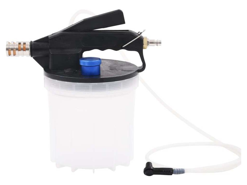Odvzdušňovač brzd je vyrobený z odolného korozivzdorného plastu a velmi snadno se čistí. Obsahuje jistící ventil a bezpečnostní kalíšek pro automatické zastavení vypouštění. Starý olej sbírá bez rozlití. Zpětný ventil zabraňuje zpětnému toku při vypouštění a háček zajišťuje průchod vzduchu pro plynulé vypouštění oleje.