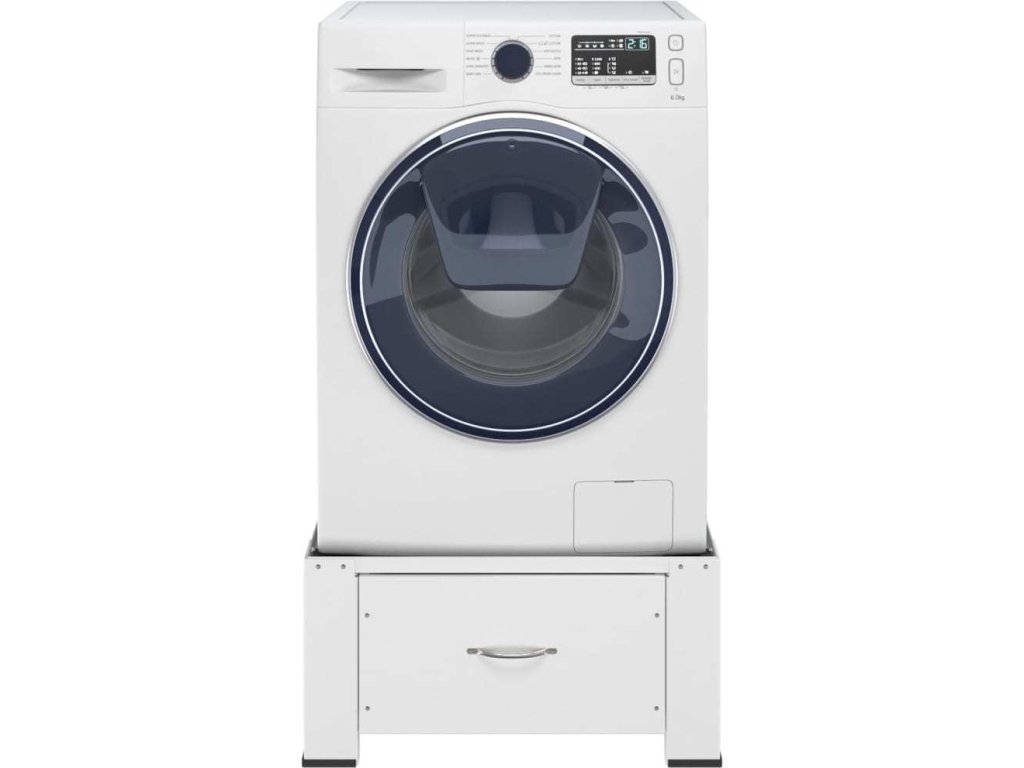 Podstavec je vyroben z oceli a udrží pračku o hmotnosti až 100 kg. Protiskluzové podložky zaručují stabilitu pračky. Nohy jsou rovněž pogumované, takže nekloužou a zároveň chrání vaši podlahu před poškrábáním. Podstavec je rovněž opatřen zásuvkou, která vám poskytne úložný prostor navíc.