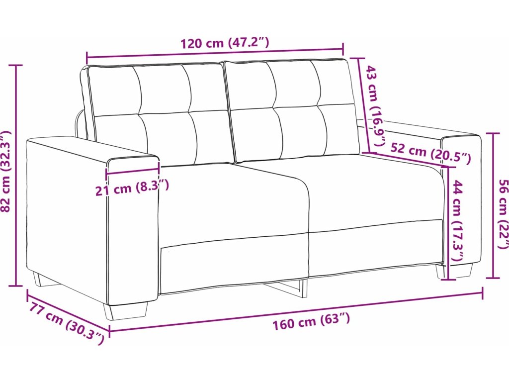 | 1 x 2-místná sedačka: | 160 x 77 x 82 cm (ŠxHxV) |