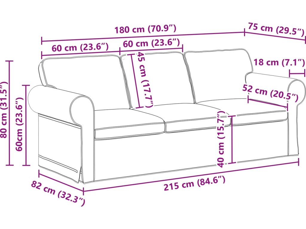 - 1 x pohovka: 215 x 82 x 80 cm (ŠxHxV)