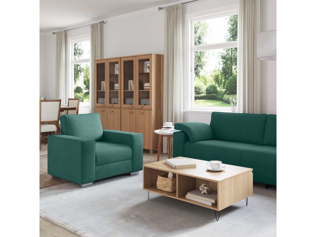- Zahrnuté komponenty: Set obsahuje křeslo, 2-místnou a 3-místnou pohovku, všechny ergonomicky navržené s širokými opěrkami pro pohodlí a odkládání drobností.
