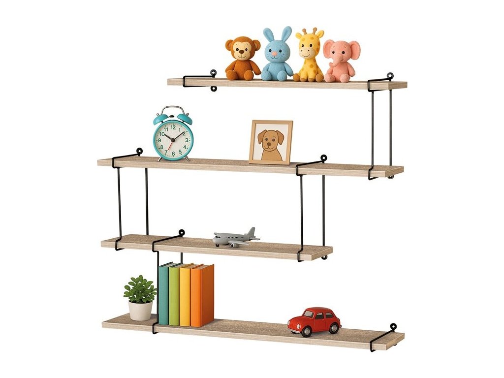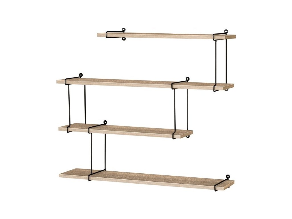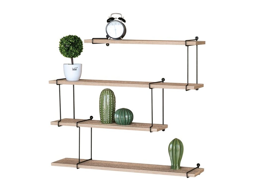 Nástěnné poličky o šířce 80 cm kombinují desky z MDF s dekorativním dubovým dekorem a černými matnými kovovými nosnými vzpěrami, které zajišťují stabilitu a pevnost. Jednoduché a praktické provedení umožňuje snadné upevnění na stěnu a nabízí dostatek odkládacího prostoru pro dekorace, knihy či drobné předměty. Povrch desek je hladký s příjemnou texturou dubového dřeva, která přináší do interiéru přírodní odstíny a vizuální efekt dřeva. Poličky jsou navrženy tak, aby byly skladné a zároveň funkční, což oceníte v různých typech prostor od obývacích pokojů po kanceláře. Černé kovové prvky doplňují celkový industriální vzhled a zvyšují nosnost celé sestavy.