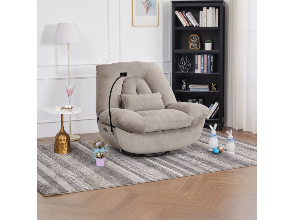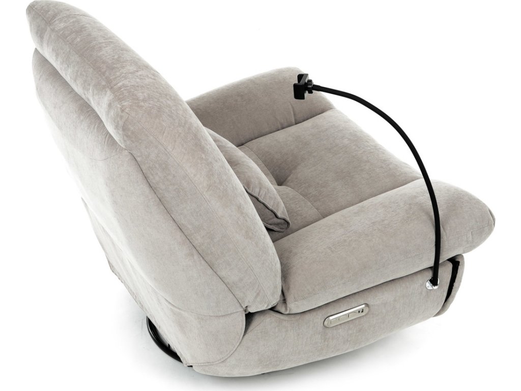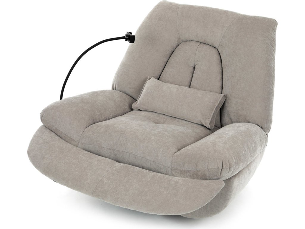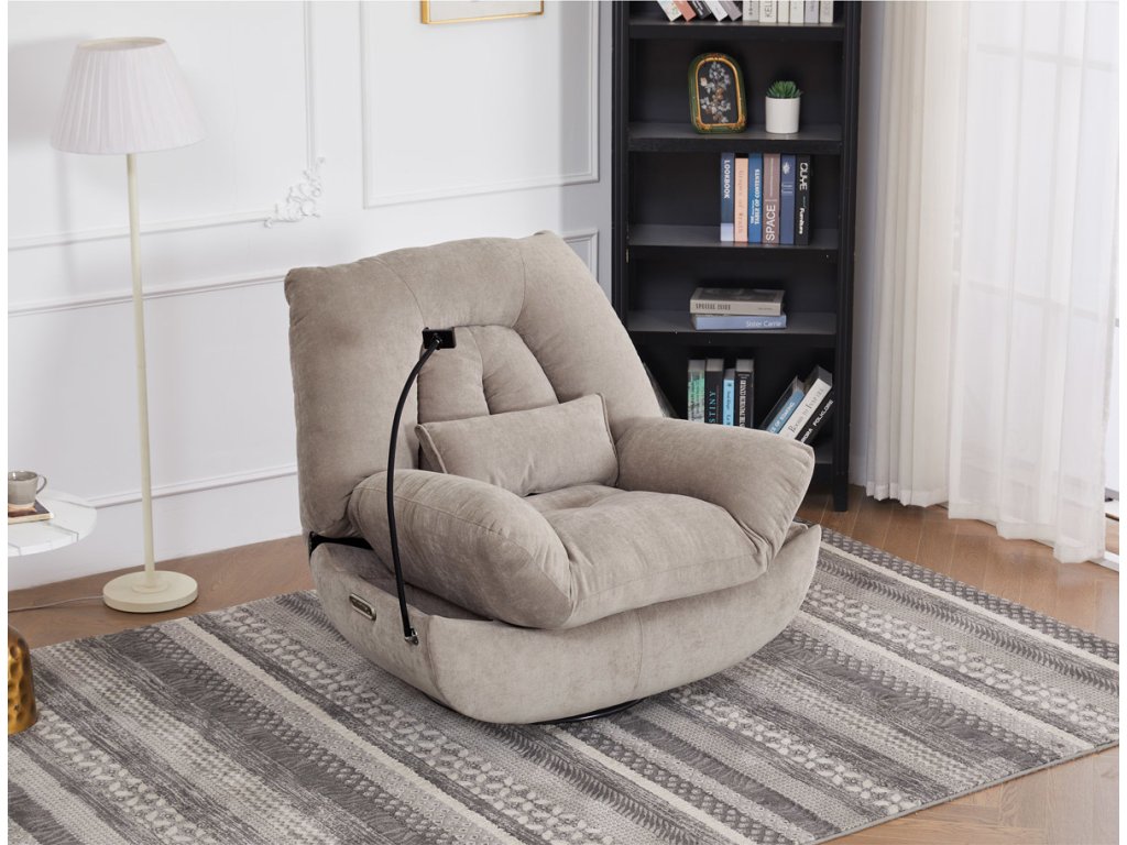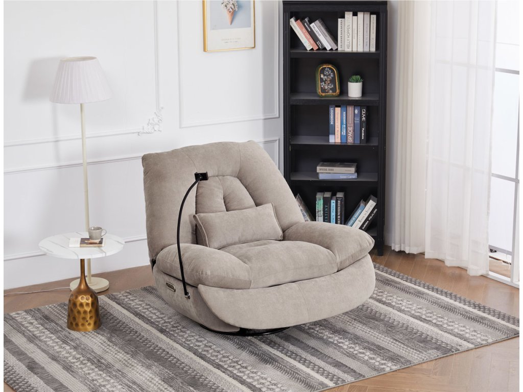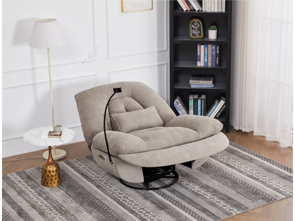 TV křeslo s elektrickým polohováním v krémové látce nabízí komfortní sezení s možností nastavení polohy. Pevná kovová podnož umožňuje rotaci až do 240° a houpací pohyb s úhlem 30°, což zvyšuje relaxační zážitek. Součástí je zabudované ovládání, držák telefonu a praktický úložný box, který pomáhá udržet pořádek v blízkosti sedacího místa. Křeslo je navrženo s ohledem na nosnost až 160 kg a rozkládací funkcí pro zvýšení pohodlí během odpočinku. Látkový potah je příjemný na dotek a snadno se udržuje, což doplňuje celkovou praktičnost tohoto multifunkčního křesla.