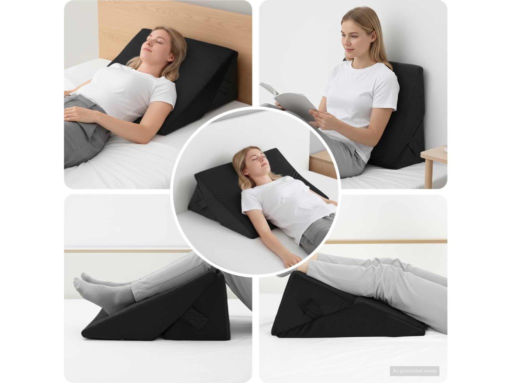 - Všestranný tvar: Klínový tvar a ergonomický design umožňují různé použití, jako například podložení nohou nebo podporu zad a krku, když sedíte. Kompaktní velikost usnadňuje přemístění po domě podle potřeby.