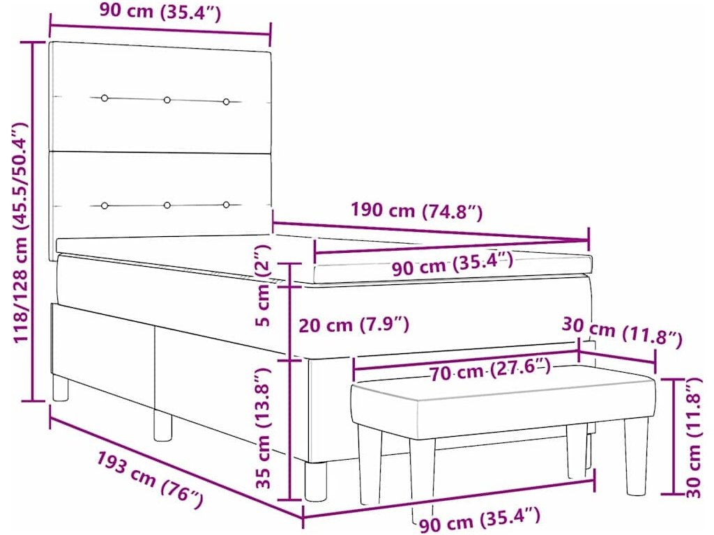 - Velikost matrace: Krátké jednolůžko (90 cm x 190 cm nebo 35" x 75")
