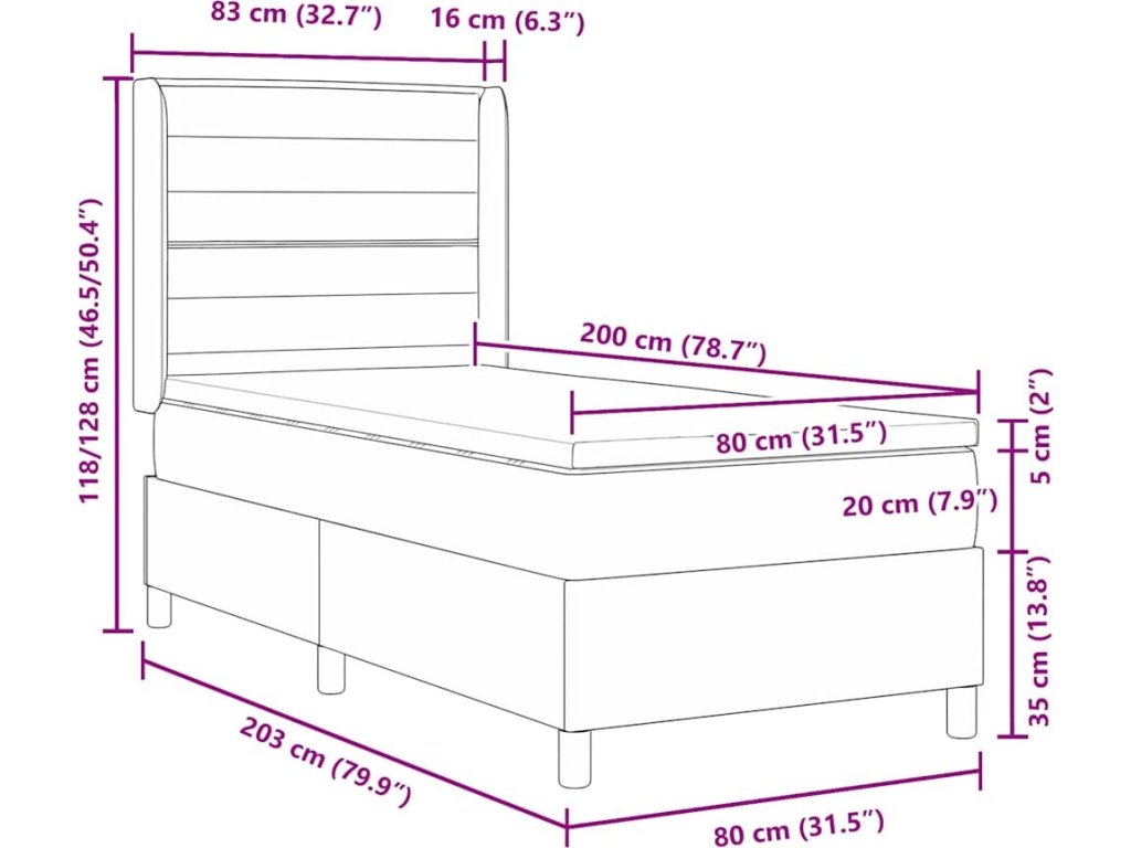 | Kompatibilní velikost matrace: | Malé jednolůžko (80 cm x 200 cm nebo 31" x 79") |