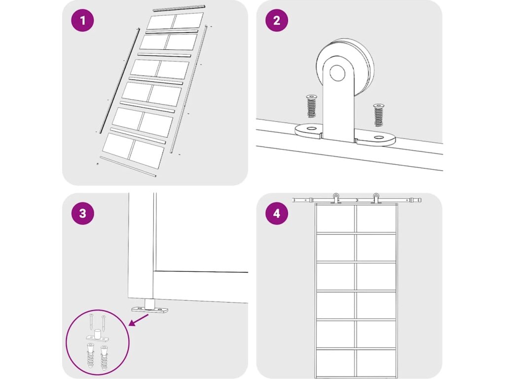 Dveře je možné nasadit pouze v kombinaci se setem kování pro posuvné dveře. Vhodné sety kování pro posuvné dveře najdete v našem obchodě (SKU: 145262–145263). Způsob montáže si můžete prohlédnout v našem instalačním manuálu pro dveře a set kování pro posuvné dveře.