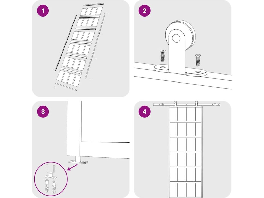 Dveře je možné nasadit pouze v kombinaci se setem kování pro posuvné dveře. Vhodné sety kování pro posuvné dveře najdete v našem obchodě (SKU: 145262–145263). Způsob montáže si můžete prohlédnout v našem instalačním manuálu pro dveře a set kování pro posuvné dveře.