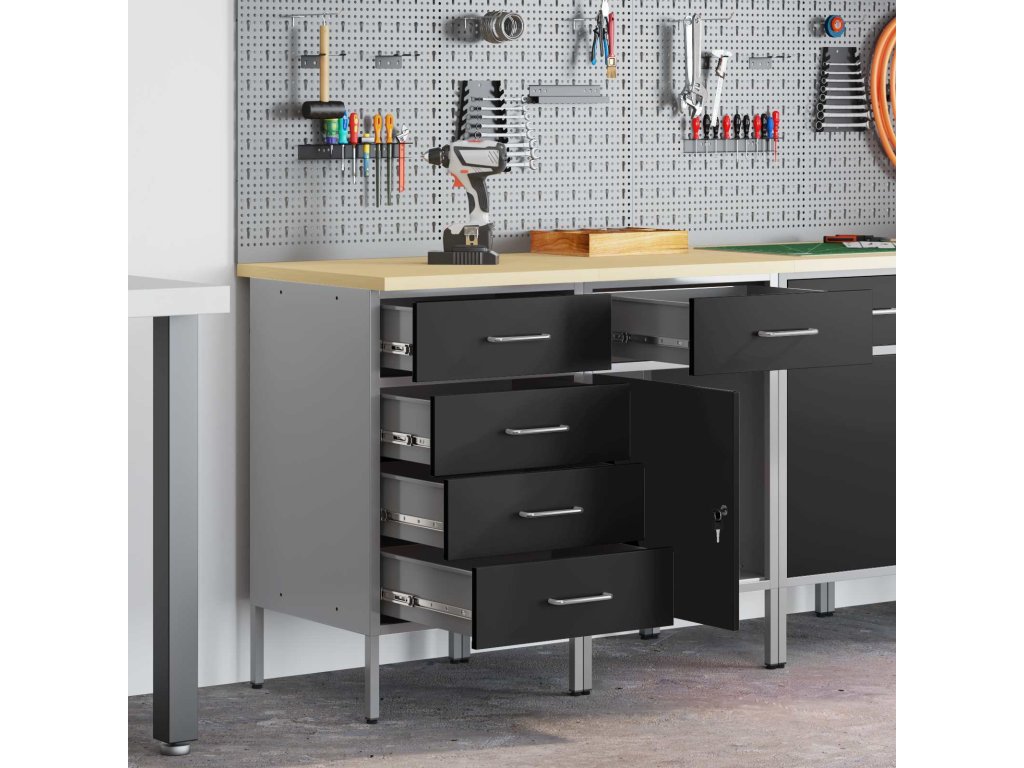 - Víceúčelové úložiště: Skříň má spoustu oddělení, šuplíků a polic, což nabízí skvělá organizační řešení. Efektivně uspořádá nástroje a materiály, což vám usnadní práci a zajistí, že všechno bude na místě. Jejím chytrým designem vyhovíte různým potřebám, od velkých nástrojů po malá příslušenství, takže je nepostradatelná pro uspořádané pracovní prostory.
