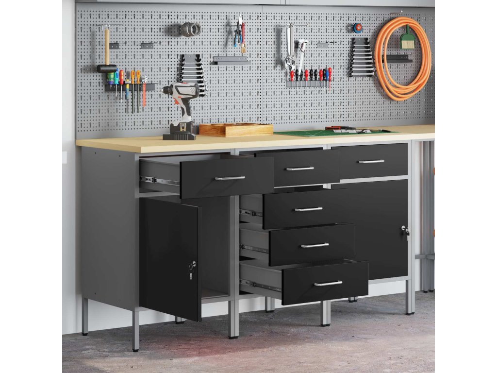 - Víceúčelové úložiště: Skříň má spoustu oddělení, šuplíků a polic, což nabízí skvělá organizační řešení. Efektivně uspořádá nástroje a materiály, což vám usnadní práci a zajistí, že všechno bude na místě. Jejím chytrým designem vyhovíte různým potřebám, od velkých nástrojů po malá příslušenství, takže je nepostradatelná pro uspořádané pracovní prostory.