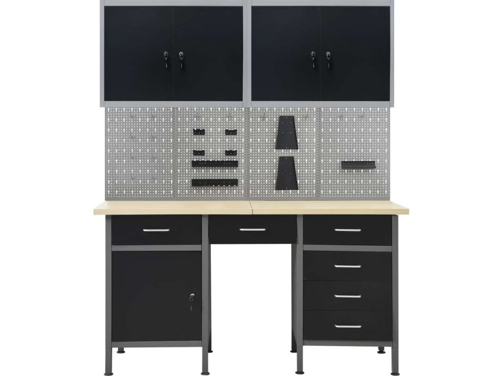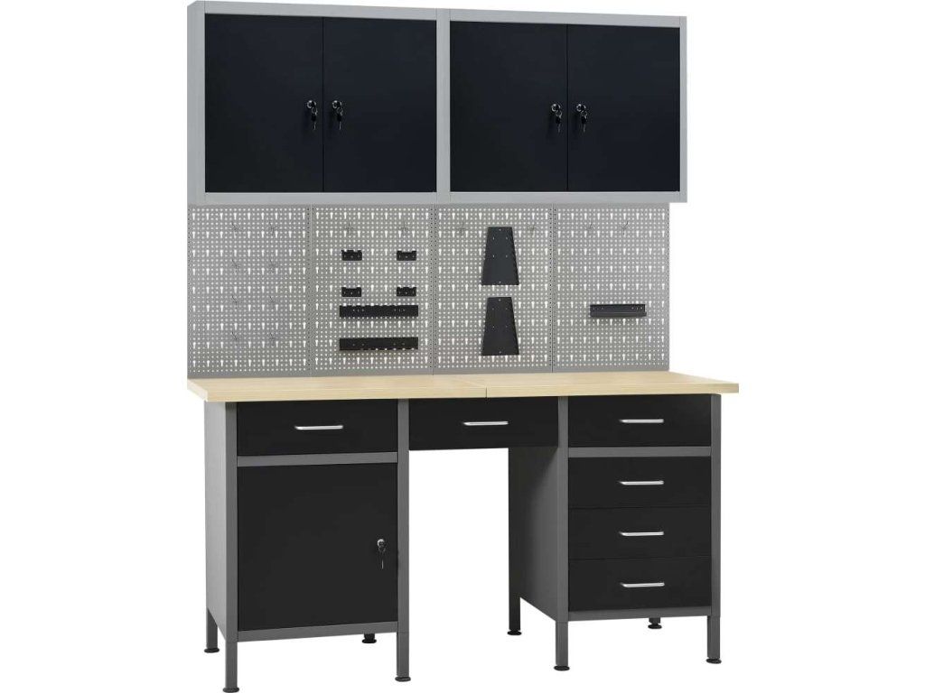 Tato dílenská sada 1 pracovního stolu se 4 nástěnnými panely a 2 nástěnnými skříňkami je praktické úložné řešení pro vaši dílnu a garáž.