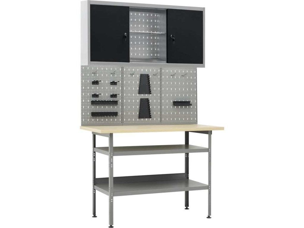 Tato dílenská sada 1 pracovního stolu se 3 nástěnnými panely a 1 nástěnnou skříňkou je praktické úložné řešení pro vaši dílnu a garáž.