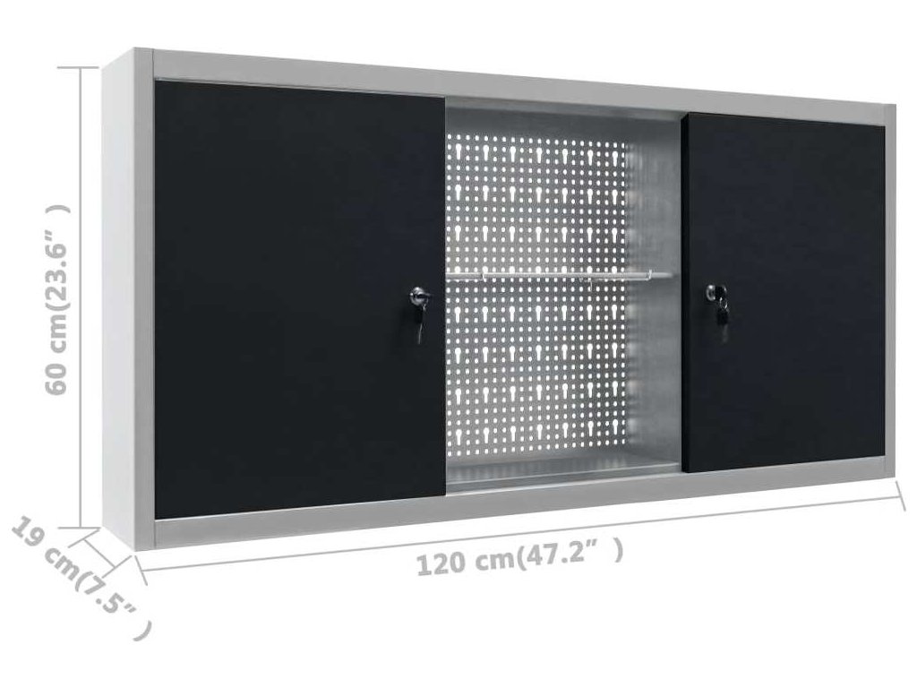 Nástěnné úložné řešení na nářadí je vybavené třemi výškově nastavitelnými policemi a děrovanou deskou s otvory, které lze použít k zavěšení různých druhů nástrojů, jako jsou klíče, kleště, kladiva apod. Obě nástěnné skříňky mají pro větší bezpečnost uzamykatelná dvířka (2 klíče pro každá dvířka). Úložná stěna je vyrobená z kovu s extra silnou vrstvou proti poškrábání, takže má dlouhou životnost a snadno se čistí. Tento produkt je třeba sestavit.