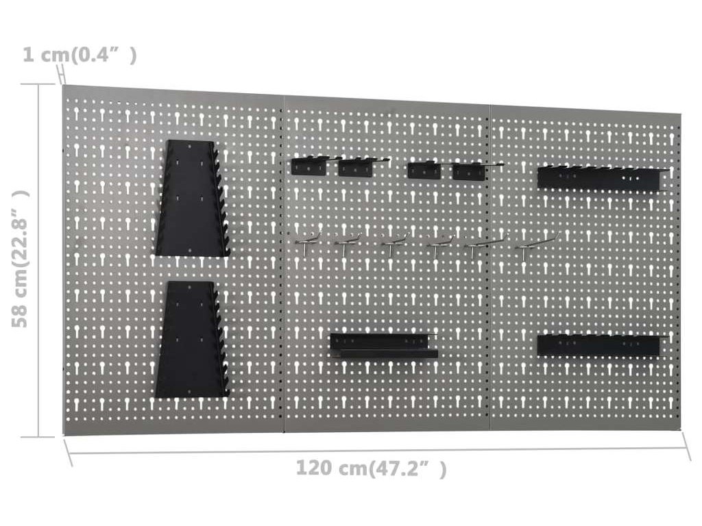 Tyto panely do dílny na nářadí jsou vyrobené z masivní oceli a unesou váhu celé řady různých nástrojů, jako jsou vrtačky, kleště, šroubováky a klíče. Panely jsou děrované pro snadné a bezpečné zavěšení nástrojů. Tyto 3 nástěnné panely je možné spojit dohromady a vytvořit jeden velmi pevný celek. Je to ideální doplněk ponků a dílenských skříní s praktickou šířkou 120 cm.