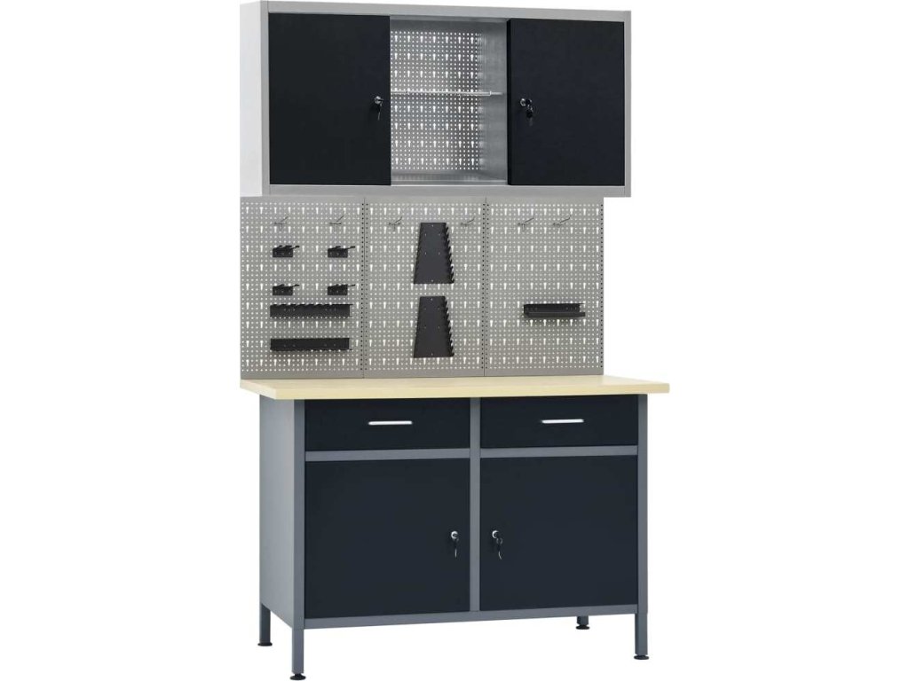 Tato dílenská sada 1 pracovního stolu se 3 nástěnnými panely a 1 nástěnnou skříňkou je praktické úložné řešení pro vaši dílnu a garáž.