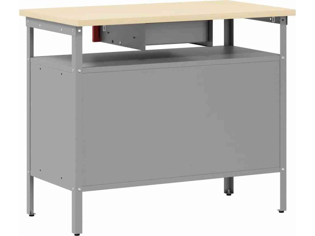 - Materiály: Tento pracovní stůl kombinuje pevné technicky zpracované dřevo a odolnou ocel, což zajišťuje dlouhou životnost a industriální vzhled. Dřevo poskytuje hladký pracovní povrch, který je jak praktický, tak atraktivní, zatímco ocel zajišťuje silnou konstrukci pro intenzivní používání.