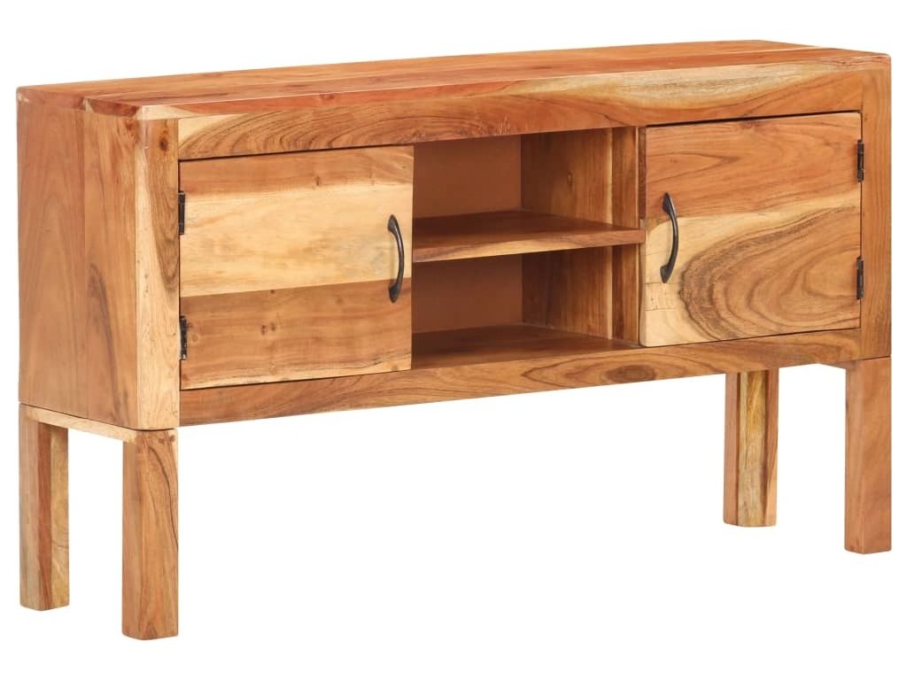 Úložná skříňka je vyrobená z masivní akácie s přírodní povrchovou úpravou, což je tvrdé dřevo s hustou texturou. Příborník má překrásný design, je stabilní, hodně toho vydrží a zaujme na první pohled. Zručné zpracování a nádherná kresba dřeva propůjčují každému kusu nábytku jedinečný charakter, takže nenajdete dva stejné. Rozměrná horní deska je pevná a skvěle se hodí k vystavení různých dekorací, jako jsou zarámované fotografie či pokojové rostliny. Robustní odkládací skříňka má dvě přihrádky s dvířky a dvě otevřené přihrádky, kde najdete spoustu místa k přehlednému uspořádání vašich časopisů, knih a všelijakých dalších maličkostí.