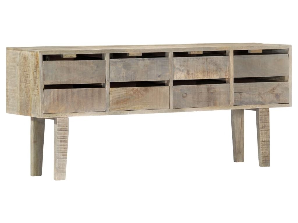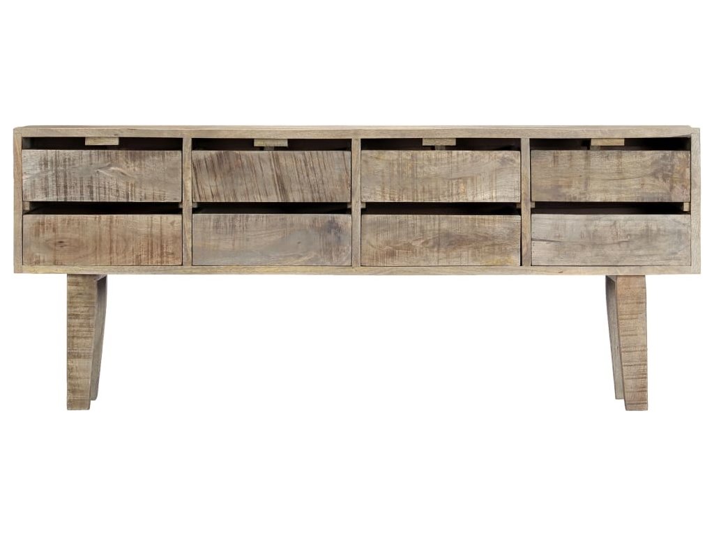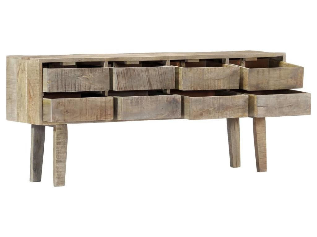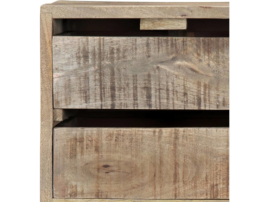 Skříňka je vyrobena z masivního mangovníkového dřeva. Byla naleštěna, natřena a nalakována, aby vynikl její půvabný a rafinovaný vzhled. Mangovník má husté a robustní tvrdé dřevo, jehož povrch se vyznačuje překrásnými hnědými či zlatavými pruhy a liniemi. Sestavení příborníku je snadné a k jeho čištění vám postačí navlhčený hadřík. Povzneste své bydlení na novou úroveň s naší elegantní skříňkou se zásuvkami!