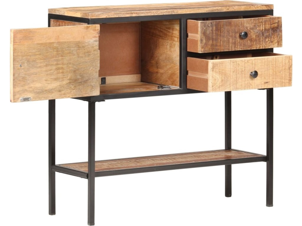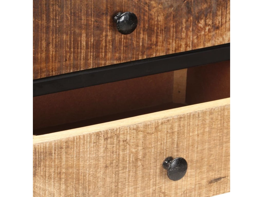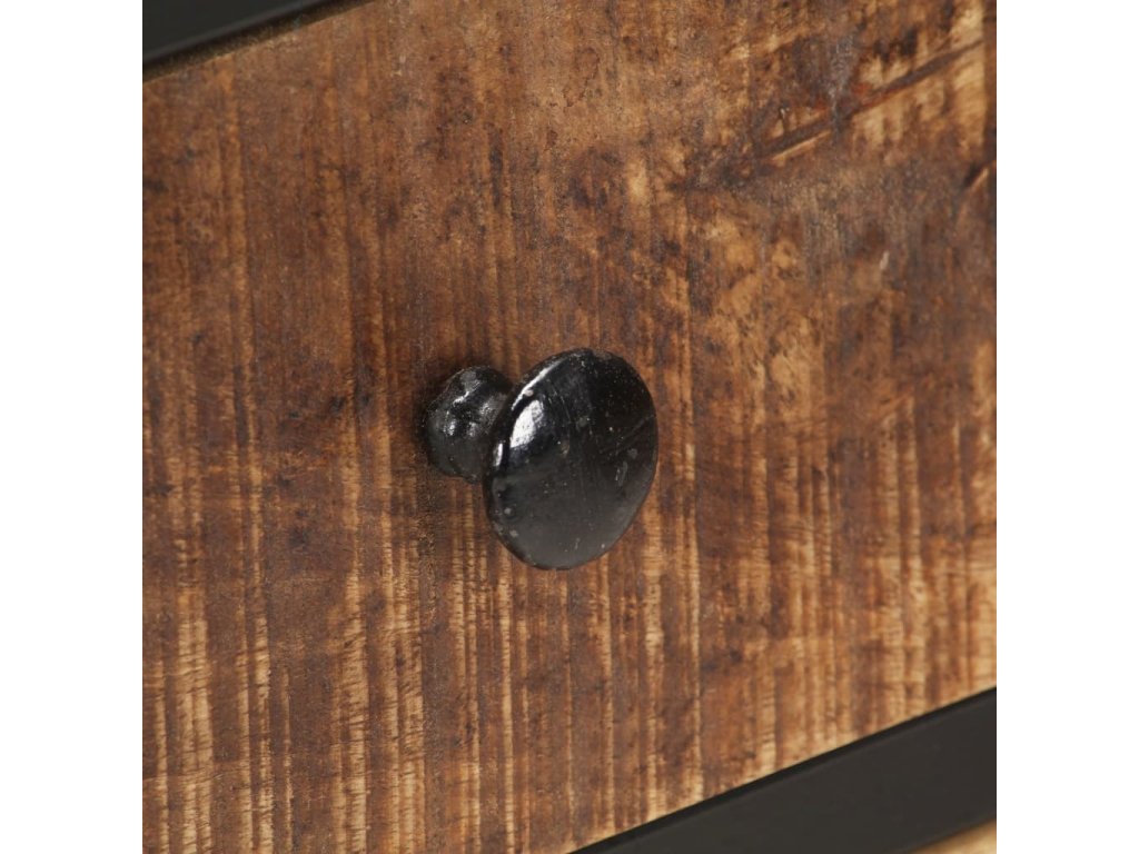 Odkládací skříňka je vyrobená z hrubého masivního mangovníku s přírodním povrchem, tropického tvrdého dřeva s velkou nosností. Také skvěle odolává opotřebení i působení času, takže je stabilní a má dlouhou životnost. Zručné zpracování a nádherná kresba dřeva dávají každému kusu jedinečný charakter, takže nenajdete dva úplně stejné. Černě práškově lakované železné nohy tvoří velmi stabilní rám. Ve skříňce je přihrádka s dvířky, dvě zásuvky a spodní police, ve kterých je spousta úložného prostoru. Pevnou horní desku lze navíc využít k vystavení nejrůznějších dekorací, jako jsou zarámované fotografie, pokojové rostliny, vázy apod.