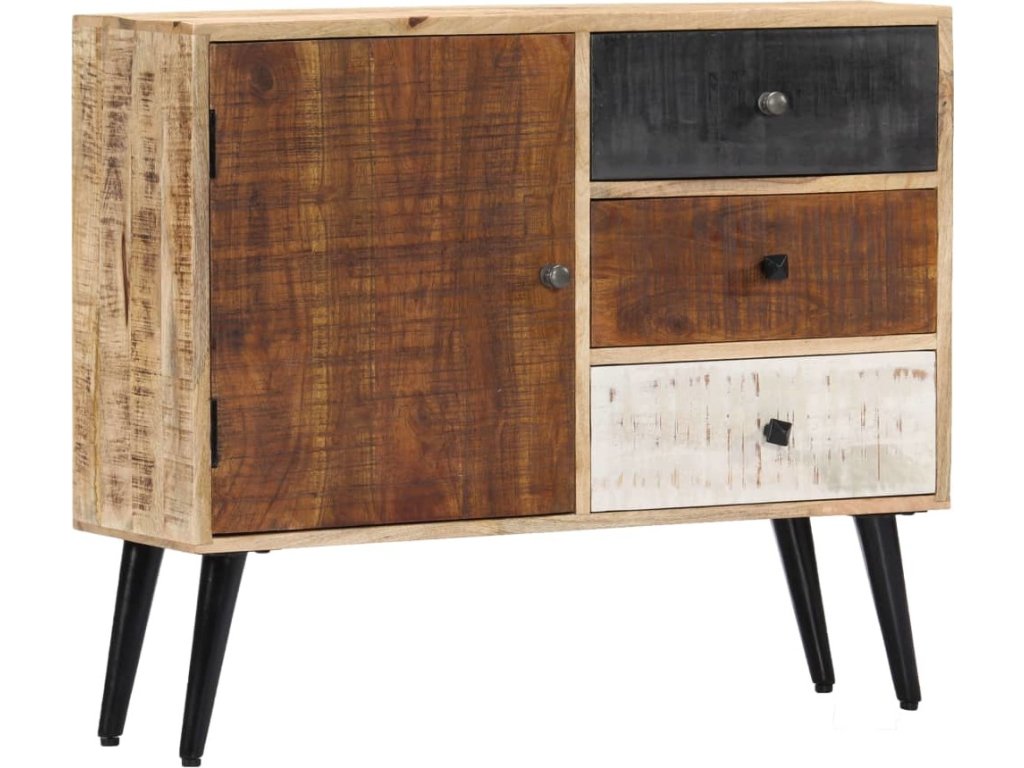 Příborník je vyrobený z masivního mangovníkového dřeva a byl naleštěný, natřený a nalakovaný, aby vynikl jeho půvabný a rafinovaný vzhled. Mangovník má husté a robustní tvrdé dřevo, jehož povrch je typický svými hnědými či zlatými pruhy a liniemi. Krásu stolku umocňují také tři zásuvky a přihrádka s dvířky, které vám poskytnou spoustu úložného prostoru, kde si můžete přehledně uspořádat boty, knížky a další různé maličkosti tak, abyste je měli po ruce. Sestavení příborníku je jednoduché a k jeho čištění vám postačí navlhčený hadřík.