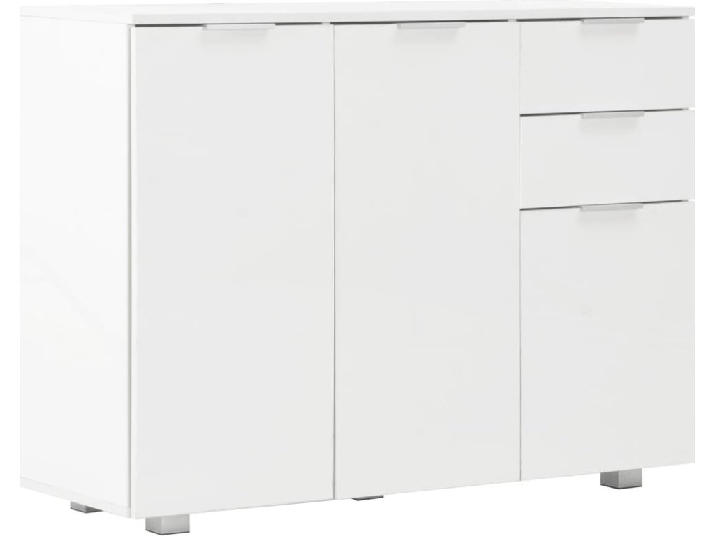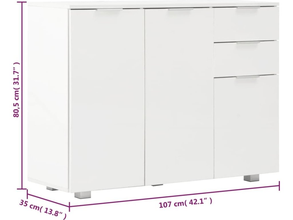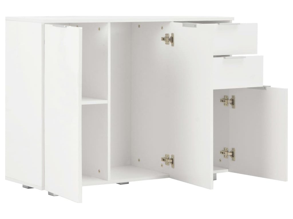 Skříňka se zásuvkami je vyrobena z kompozitního dřeva s vysoce lesklou bílou povrchovou úpravou. Vyniká proto svým rafinovaným vzhledem a zároveň je mimořádně stabilní a odolná. K uschování vašich potřeb můžete využít 2 zásuvky a 2 skříňky s dvířky, kde najdete dostatek úložného prostoru, takže váš obývací pokoj zůstane příjemně uklizený. Příborník s lesklým povrchem se snadno čistí. Dejte svému interiéru nový šarm s naší elegantní odkládací skříňkou!