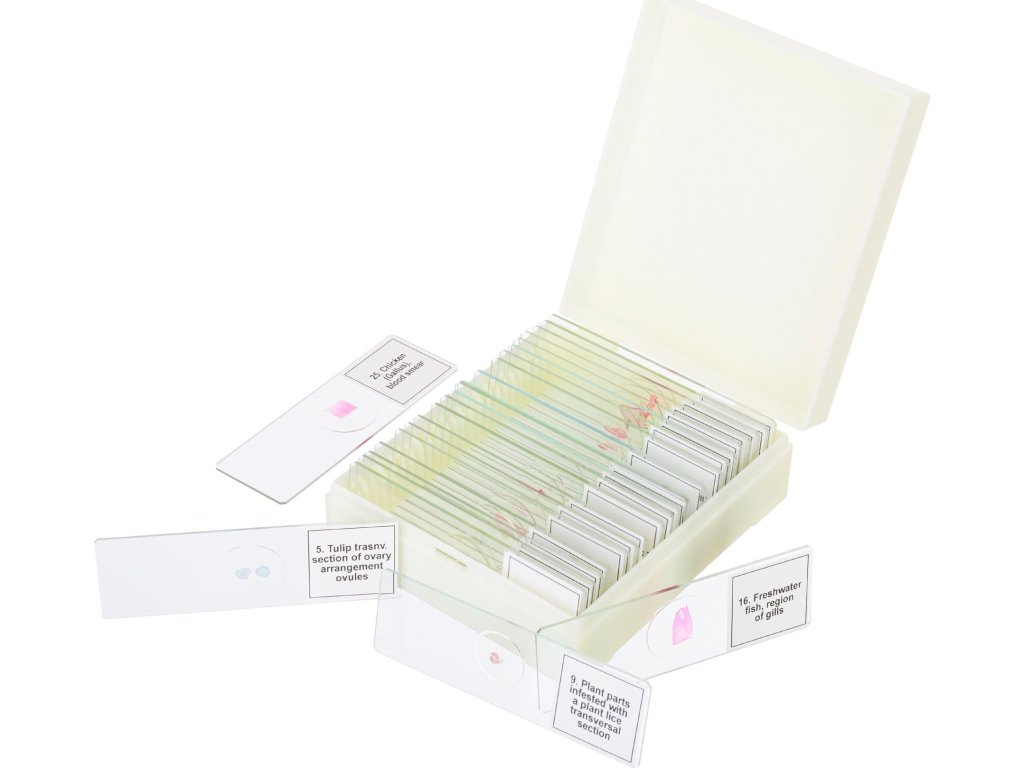 - Součástí sady je 50 krycích sklíček a 24 podložných sklíček pro tvorbu vlastních preparátů